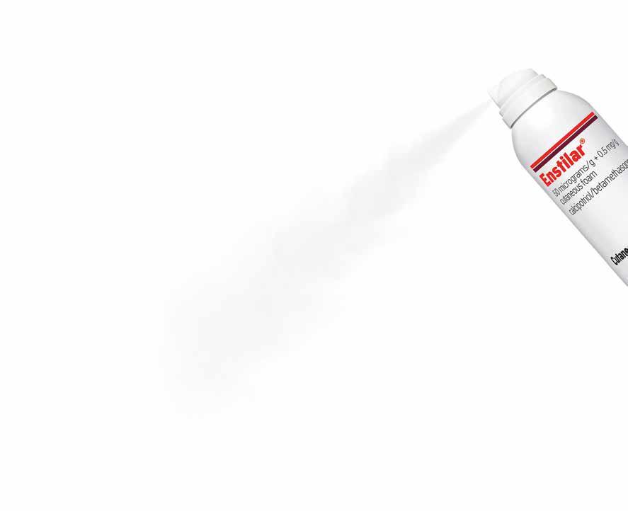 Indication: Topical treatment of psoriasis vulgaris in adults. Active ingredients: 50 µg/g calcipotriol (as monohydrate) and 0.5 mg/g betamethasone (as dipropionate). Dosage and administration: Flare treatment: Apply by spraying onto affected area once daily. Recommended treatment period is 4 weeks. If it is necessary to continue or restart treatment after this period, treatment should be continued after medical review and under regular supervision. Longterm maintenance treatment: Patients who have responded at 4 weeks’ treatment using Enstilar once daily are suitable for long-term maintenance treatment. Enstilar should be applied twice weekly on two non-consecutive days to areas previously affected by psoriasis vulgaris. Between applications there should be 2-3 days without Enstilar treatment. If signs of a relapse occur, flare treatment, as described above, should be re-initiated. Maximum dose: The daily maximum dose of Enstilar should not exceed 15 g, i.e. one 60 g can should last for at least 4 days of treatment. 15 g corresponds to the amount administered from the can if the actuator is fully depressed for approximately one minute. A two-second application delivers approximately 0.5 g. As a guide, 0.5 g of foam should cover an area of skin roughly corresponding to the surface area of an adult hand. If using other calcipotriol-containing medical products in addition to Enstilar, the total dose of all calcipotriol-containing products should not exceed 15 g per day. Total body surface area treated should not exceed 30%. Safety and efficacy in patients with severe renal insufficiency or severe hepatic disorders have not been evaluated. Safety and efficacy in children below 18 years have not been established. Shake the can for a few seconds before use. Apply by spraying, holding the can at least 3 cm from the skin, in any orientation except horizontally. Spray directly onto each affected skin area and rub in gently. If used on the scalp, spray into the palm of the hand then apply to affected scalp areas with the fingertips. See hair washing instructions in the package leaflet. Wash hands after use (unless Enstilar is used to treat the hands) to avoid accidentally spreading to other parts of the body as well as unintended drug absorption on the hands. Avoid application under occlusive dressings since systemic absorption of corticosteroids increases. It is recommended not to take a shower or bath immediately after application. Let the foam remain on the scalp and/or skin during the night or during the day. Contraindications: Hypersensitivity to the active substances or any of the excipients. Erythrodermic and pustular psoriasis. Patients with known disorders of calcium metabolism. Viral (e.g. herpes or varicella) skin lesions, fungal or bacterial skin infections, parasitic infections, skin manifestations in relation to tuberculosis, perioral dermatitis, atrophic skin, striae atrophicae, fragility of skin veins, ichthyosis, acne vulgaris,