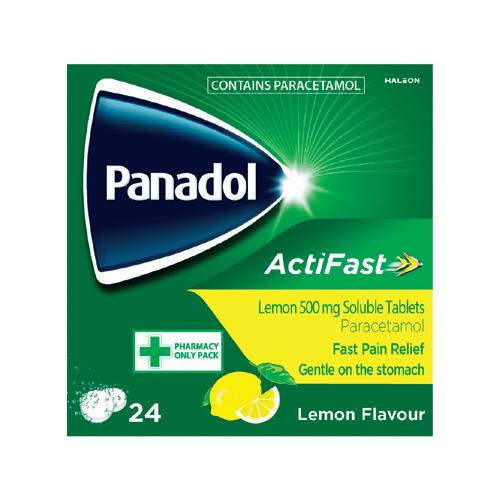 Panadol Actifast Lemon 500 mg Soluble Tablets (paracetamol) Indications: Short-term management of symptoms of headaches, musculoskeletal disorders, menstrual pain, toothache, colds and flu, as well as symptomatic relief of mild to moderate pain associated with doctor-diagnosed osteoarthritis. Dosage: Adults (including the elderly) and children 16 years and over: 1-2 tablets up to 4 times daily, as required. Children aged 10-15 years: 1 tablet up to 4 times daily, as required. Max 4 doses in 24 hours. Do not give to children for more than 3 days without consulting a doctor. Do not give to children under 10 years. Minimum dosing interval: 4 hours. Contraindications: Hypersensitivity to paracetamol or any of the other ingredients. Precautions: Do not use with any other paracetamol-containing products. Use with caution in patients with glutathione depleted states, those with risk factors for hepatotoxicity (see SPC for list). Caution, due to paracetamol, if administered with flucloxacillin due to increased risk of high anion gap metabolic acidosis. Contains: 427 mg sodium per tablet, use with caution in those on a low sodium diet. 50 mg sorbitol per tablet Patients with hereditary fructose intolerance should not take this medicinal product. Side e ects: All very rare: Thrombocytopaenia, hypersensitivity reactions including anaphylaxis, skin rash, angioedema, Stevens-Johnson syndrome, Toxic Epidermal Necrolysis, serious skin reactions, bronchospasm, hepatic dysfunction. MA Holder: Haleon Ireland Limited, 12 Riverwalk, CityWest Business Campus, Dublin 24. MA Number: PA 678/39/17. Legal Category: Pharmacy Only. Text revised: January 2024. Further information available on request. Contains Paracetamol. Always read the label/leaflet.