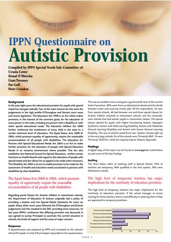 Findings A digital copy of this report can be found on www.ippn.ie. Listed below are just some of the key findings Staffing The chart below refers to teaching staff in Special Classes. 53% of teachers are temporary, 46% qualified in the Irish system, 18% were Montessori trained.