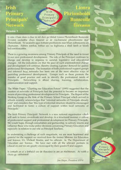 inter-school visits were facilitated, with great success. His successor was Meath principal Brendan McCabe, whose presidency saw IPPN grow very strong links with the National Parents Council (NPC) and the development of a significant shared policy document.