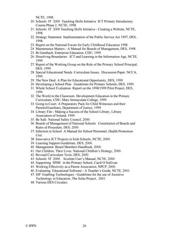 NCTE, 1998. 20. Schools IT 2000 Teaching Skills Initiative ICT Primary Introductory Course Phase 2, NCTE, 1998. 21. Schools IT 2000 Teaching Skills Initiative - Creating a Website, NCTE, 1998. 22. Strategy Statement Implementation of the Public Service Act 1997, DES, 1998. 23. Report on the National Forum for Early Childhood Education 1998. 24. Maintenance Matters - A Manual for Boards of Management, DES, 1998. 25. Bi Gnothach, Enterprise Education, CDU, 1999. 26. Dissolving Boundaries: ICT and Learning in the Information Age, NCTE, 1999. 27. Report of the Working Group on the Role of the Primary School Principal, DES, 1999. 28. Special Educational Needs Curriculum Issues, Discussion Paper, NCCA, 1999. 29. The New Deal. A Plan for Educational Opportunity, DES, 1999. 30. Developing a School Plan. Guidelines for Primary Schools, DES, 1999. 31. Whole School Evaluation. Report on the 1998/1999 Pilot Project, DES, 1999. 32. The World in the Classroom. Development Education in the Primary Curriculum, CDU, Mary Immaculate College, 1999. 33. Going to Court. A Preparatory Pack for Child Witnesses and their Parents/Guardians, Department of Justice, 1999. 34. Library File - Making a Success of the School Library, Library Association of Ireland, 1999. 35. Be Safe. National Safety Council, 2000. 36. Boards of Management of National Schools. Constitution of Boards and Rules of Procedure, DES, 2000. 37. Infection in School .A Manual for School Personnel, Health Promotion Unit 38. Innovative ICT Projects in Irish Schools, NCTE, 2000. 39. Learning Support Guidelines, DES, 2000. 40. Management Board Members Handbook, 2000. 41. Our Children. Their Lives. National Children’s Strategy, 2000. 42. Revised Curriculum Texts, DES, 2000. 43. Schools IT 2000. Scoilnet User’s Manual, NCTE, 2000 44. Supporting SPHE in the Primary School, Carol O Sullivan. 45. Working Effectively as a Parent Association, NPCP, 2000. 46. Evaluating Educational Software - A Teacher’s Guide, NCTE, 2001. 47. SIP Enabling Technologies - Guidelines for the use of Assistive Technology in Education, The Solas Project, 2001. 48. Various DES Circulars.