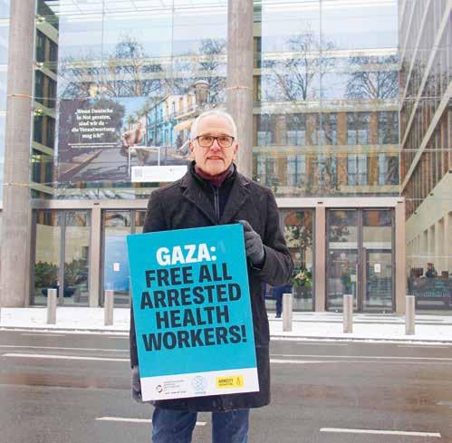 Bei der Kundgebung vor dem Auswärtigen Amt berichtete Dr. Uwe Trieschmann über den lebensbedrohlichen Zustand, in dem sich Abu Safiya nach wiederholter Folter befindet. „Die Verhaftung von Dr. Hussam Abu Safiya ist Teil der Angriffe auf das Gesundheitssystem in Gaza. Deshalb geht es mit seiner Verteidigung auch um die Verteidigung des Gesundheitswesens und des Völkerrechts. Medizinisches Personal muss seine Aufgaben ausüben können, ohne Einschüchterung, willkürliche Inhaftierung oder Gewalt befürchten zu müssen.“