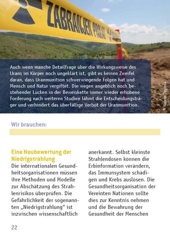 anerkannt. Selbst kleinste Strahlendosen können die Erbinformation verändern, das Immunsystem schädigen und Krebs auslösen. Die Gesundheitsorganisation der Vereinten Nationen sollte dies zur Kenntnis nehmen und die Bewahrung der Gesundheit der Menschen