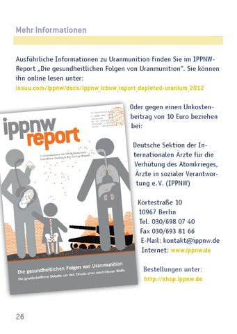 Mehr Informationen Ausführliche Informationen zu Uranmunition finden Sie im IPPNWReport „Die gesundheitlichen Folgen von Uranmunition“. Sie können ihn online lesen unter: issuu.com/ippnw/docs/ippnw_icbuw_report_depleted-uranium_2012 Oder gegen einen Unkostenbeitrag von 10 Euro beziehen bei: Deutsche Sektion der Internationalen Ärzte für die Verhütung des Atomkrieges, Ärzte in sozialer Verantwortung e. V. (IPPNW) Körtestraße 10 10967 Berlin Tel. 030/698 07 40 Fax 030/693 81 66 E-Mail: kontakt@ippnw.de Internet: www.ippnw.de Bestellungen unter: http://shop.ippnw.de