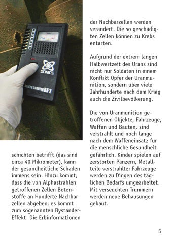 der Nachbarzellen werden verändert. Die so geschädigten Zellen können zu Krebs entarten. Aufgrund der extrem langen Halbwertzeit des Urans sind nicht nur Soldaten in einem Konflikt Opfer der Uranmunition, sondern über viele Jahrhunderte nach dem Krieg auch die Zivilbevölkerung.