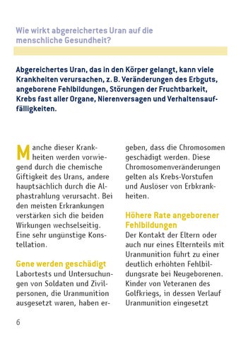 Wie wirkt abgereichertes Uran auf die menschliche Gesundheit? Abgereichertes Uran, das in den Körper gelangt, kann viele Krankheiten verursachen, z. B. Veränderungen des Erbguts, angeborene Fehlbildungen, Störungen der Fruchtbarkeit, Krebs fast aller Organe, Nierenversagen und Verhaltensauffälligkeiten.
