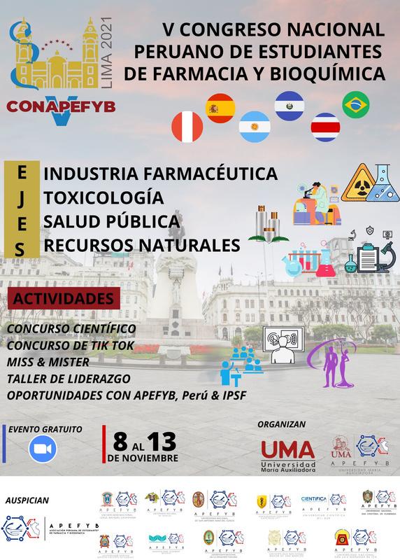 Dans le cadre de ces objectifs, chaque année, notre événement le plus important a lieu: Le V Congrès national péruvien des étudiants en pharmacie et biochimie où nous promouvons l'amélioration des compétences et augmentons les connaissances des étudiants dans différents domaines thématiques ainsi que des événements sociaux à partager avec tous les membres à l'échelle nationale En 2019, le dernier congrès national s'est tenu en personne et en 2021 la cinquième édition se tiendra dans son format virtuel