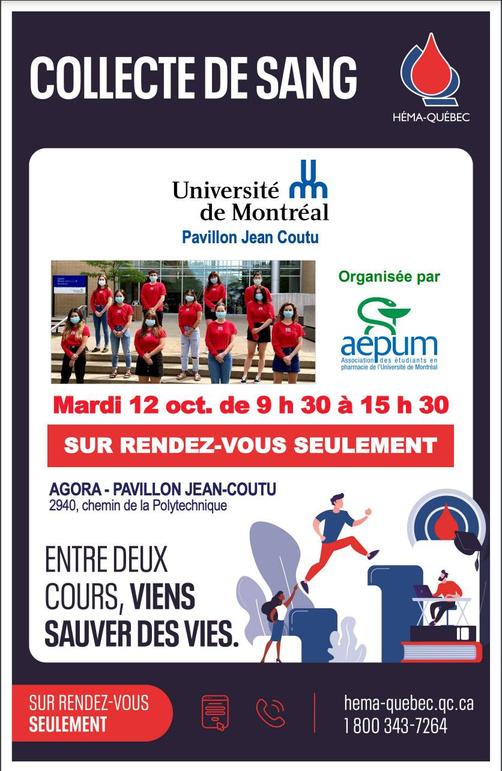 En octubre de 2021, los representantes de la IPSF en la Universidad de Montreal, en colaboración con Hema Quebec, organizaron una campaña de donación de sangre Promovieron el evento en sus medios sociales y establecieron un lugar en la universidad para que los estudiantes de farmacia pudieran donar sangre durante su hora de almuerzo En total, recibieron 46 donaciones La asociación establecida con Hema Quebec permitió que el evento se desarrollara sin problemas y también permitió la realización de campañas de donación de sangre regulares en la universidad