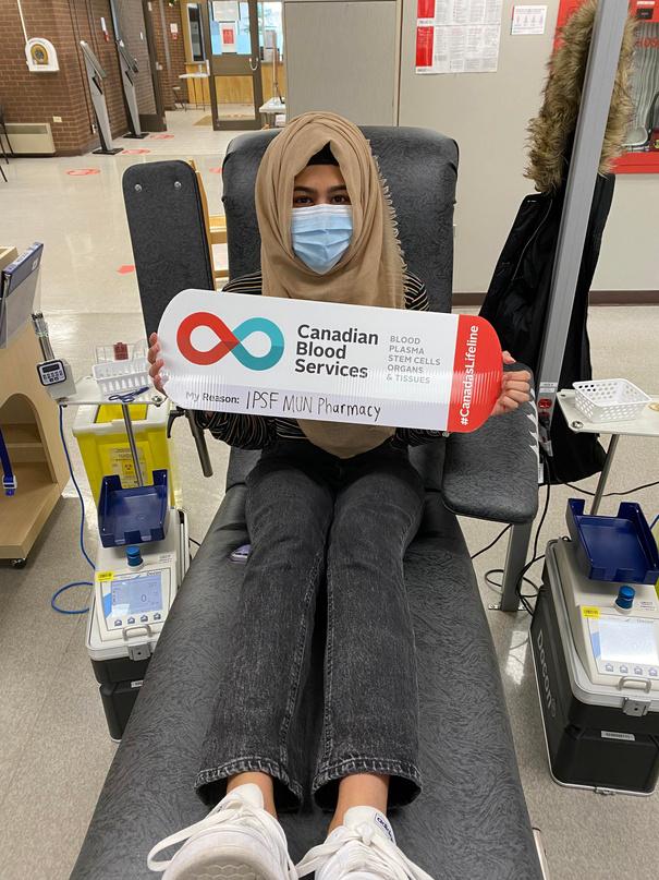 Más tarde, en noviembre de 2021, los representantes de la IPSF en la Memorial University of Newfoundland (MUN) realizaron una campaña de donación de sangre en su centro local de donantes del Canadian Blood Services El evento se promocionó mediante carteles físicos y a través de las redes sociales Se ofrecieron incentivos como barras de granola, bocadillos y vales para un restaurante local para promover el aumento de las donaciones The Canadian Blood Services proporcionaron información sobre la elegibilidad y la importancia de las donaciones de sangre