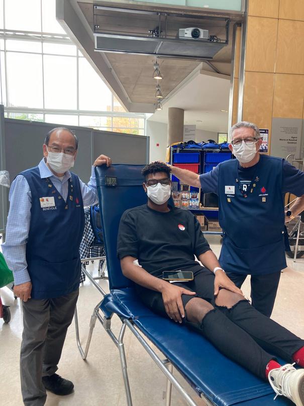 Figura 3 Todas las sonrisas se desvanecen con las máscaras mientras el estudiante posa con el representante de Hema Quebec después de derramar sangre