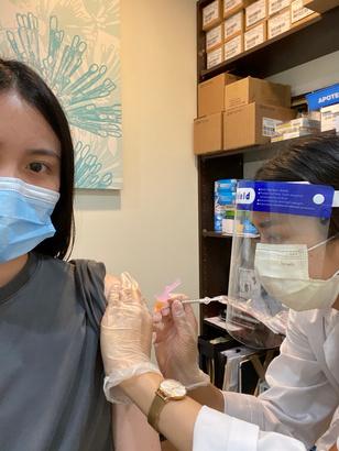 Figura 1 Camille administrando una segunda dosis de la vacuna de Pfizer a un paciente de Pharmasave