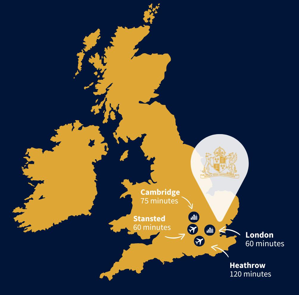 We are within an hour of London Stansted (airport), an hour of London Liverpool Street (train station), an hour of the historic University city of Cambridge, and under two hours from London Heathrow (airport).