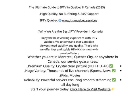 IPTV Quebec provides high-quality IPTV streaming with access to thousands of live TV channels, movies, and series in HD, FHD, and 4K. β What We Offer: Ultra-fast IPTV activation Stable servers with anti-freeze technology Daily updated video-on-demand (VOD) library Works on Smart TV, Android, iOS, Windows, MAG, Apple TV Affordable IPTV plans starting at $15 24/7 customer support ? Official Website https://iptvquebec.services/ ? Contact WhatsApp: +212726023657 Email: iptvquebec69@gmail.com