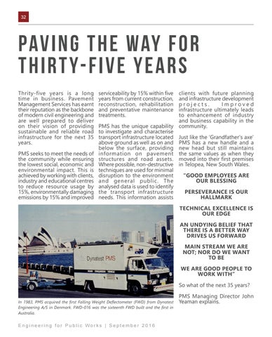paving the way for thirty-five years Thrity-five years is a long time in business. Pavement Management Services has earnt their reputation as the backbone of modern civil engineering and are well prepared to deliver on their vision of providing sustainable and reliable road infrastructure for the next 35 years. PMS seeks to meet the needs of the community while ensuring the lowest social, economic and environmental impact. This is achieved by working with clients, industry and educational centres to reduce resource usage by 15%, environmentally damaging emissions by 15% and improved