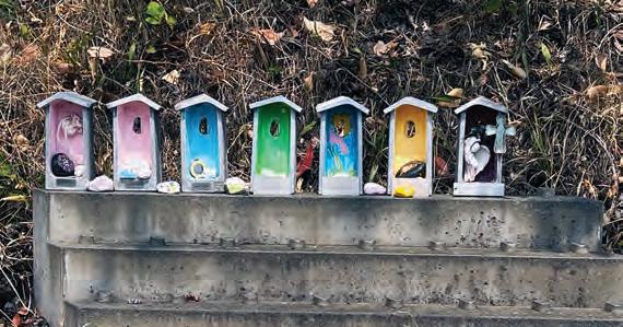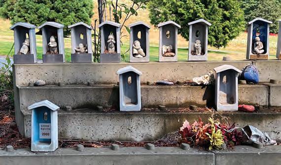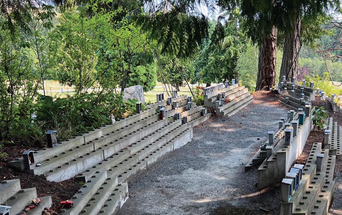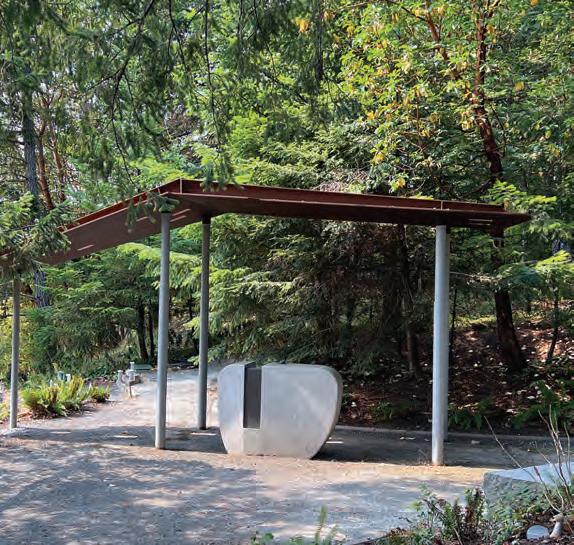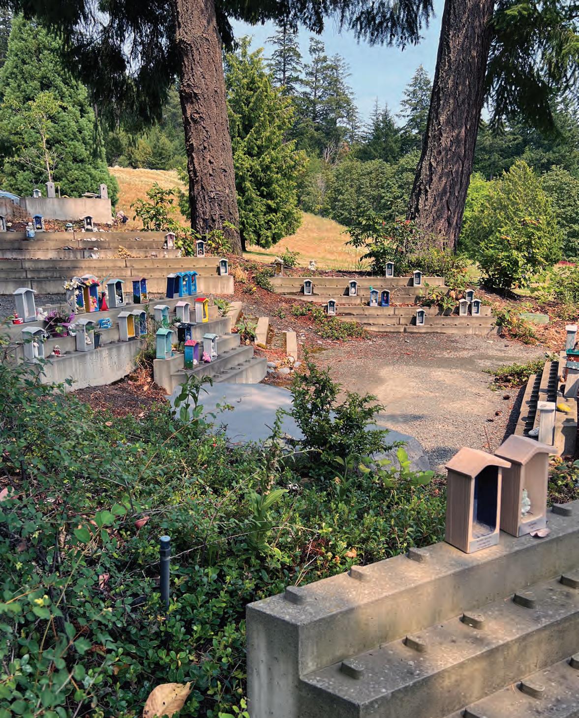 porary columbaria, sheltered by thin concrete roofs. Little Spirits Garden (2013), in Victoria, B.C., commemorates lost infants with personalized, house-shaped forms arrayed on landscapehugging concrete bars (see page 44).