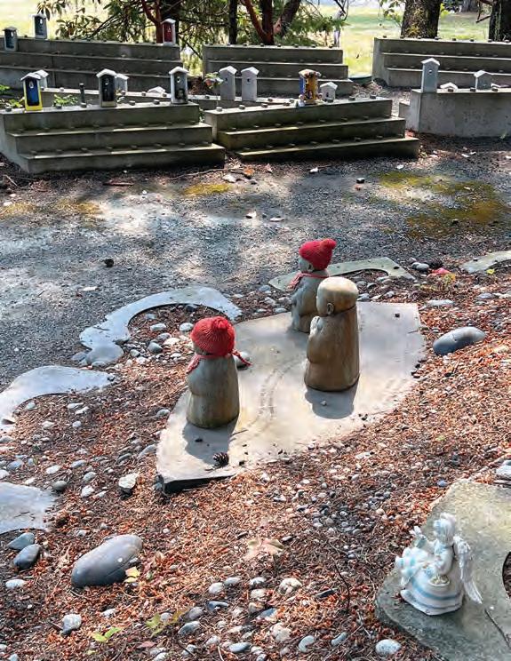 When passing through the garden and reading the poetry and images that overfill the houses it is impossible to remain unmoved. Some houses contain thoughts and emotions directed to the lost child, while others are more religious or personal. As the garden was to be ecumenical, religious imagery was proscribed in the original program the reason for the cemetery’s being called little spirits rather than little souls. Nonetheless, small angels and other symbols of Christianity do appear here and there. These are minor evasions of the original intentions, however, and perhaps in the end just recall childhood more than liturgy. In addition, several jizō figures with their red bibs and caps have appeared, presumably installed by Japanese-Canadian families, and thus completing the cycle of original reference to the final design.
