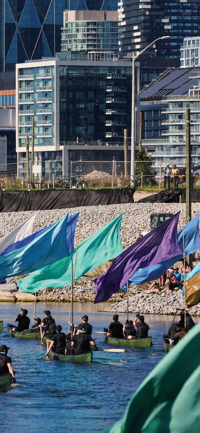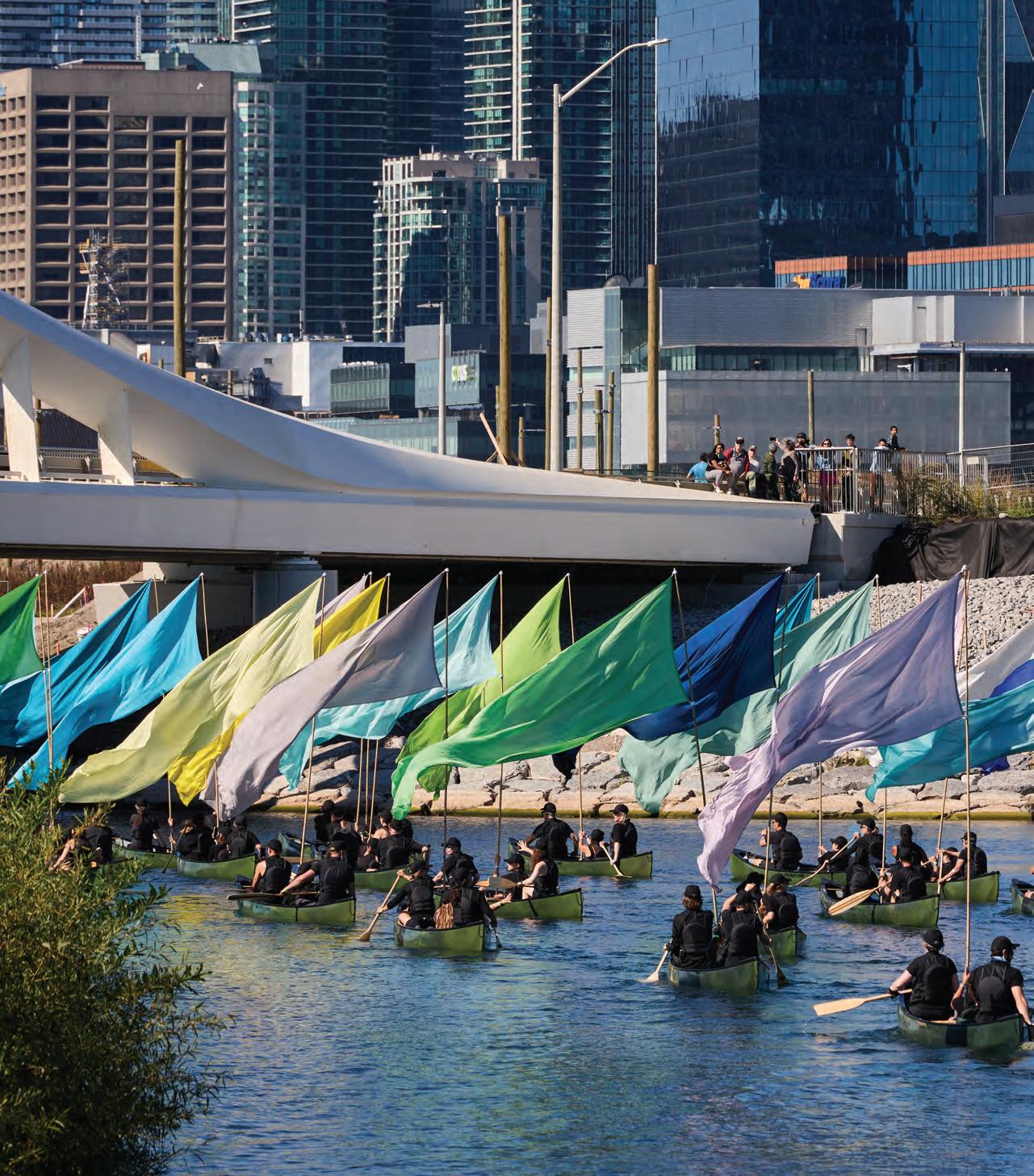 park on Toronto’s waterfront. The park is part of a masterplan by MVVA that builds a new, naturalized mouth for the Don River, and protects 174 hectares of land in the Port Lands and eastern waterfront from flooding, unlocking space for future mixed-use neighbourhoods. While Biidaasige’s parkland and playgrounds were officially inaugurated this summer, its waterways enjoyed a kind of second inauguration this fall. Photographer Amanda Large captured the event: a performance by artist Melissa McGill, featuring a flotilla of 120 canoes with hand-dyed flags, travelling from Biidaasige to the city’s harbour.