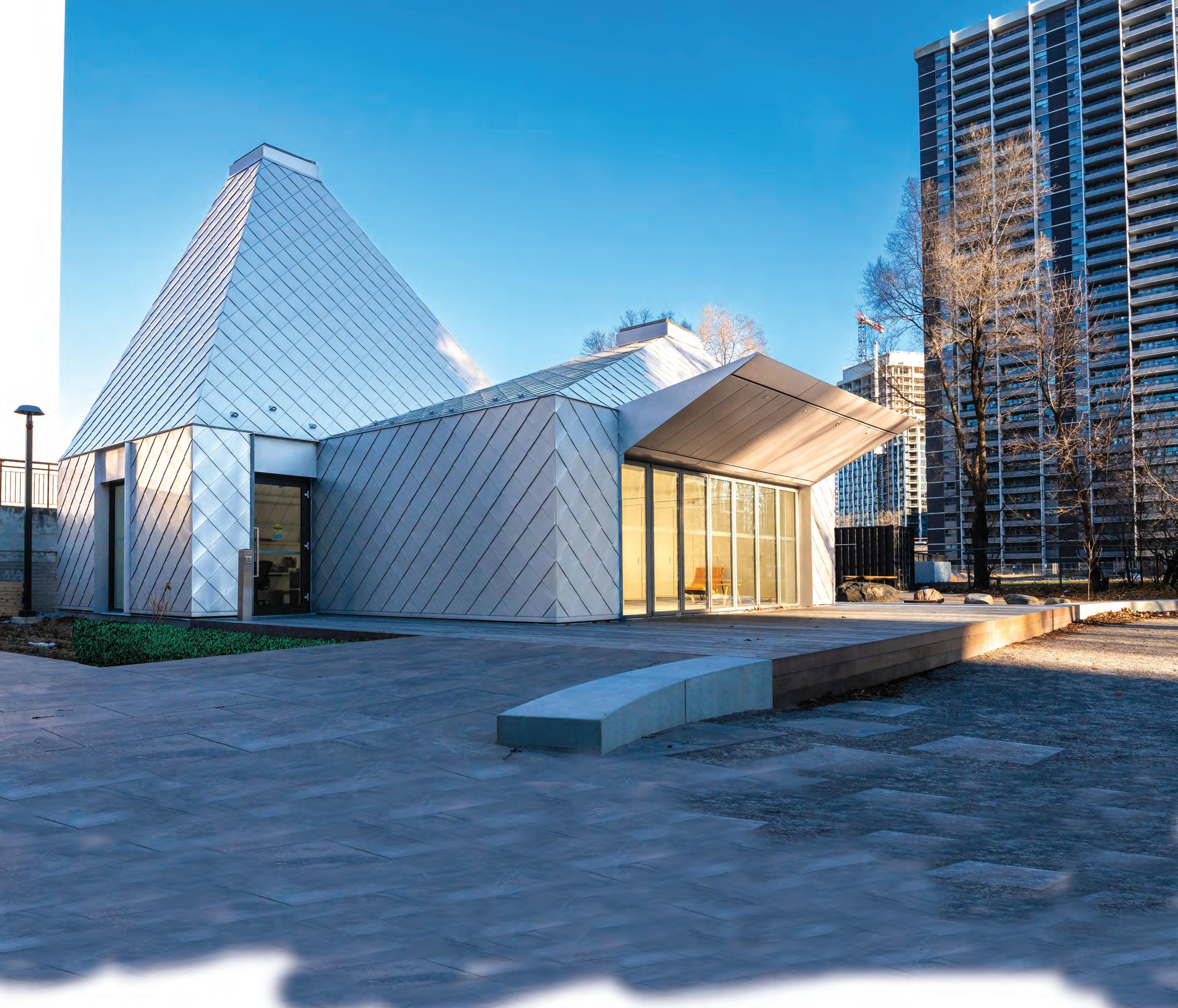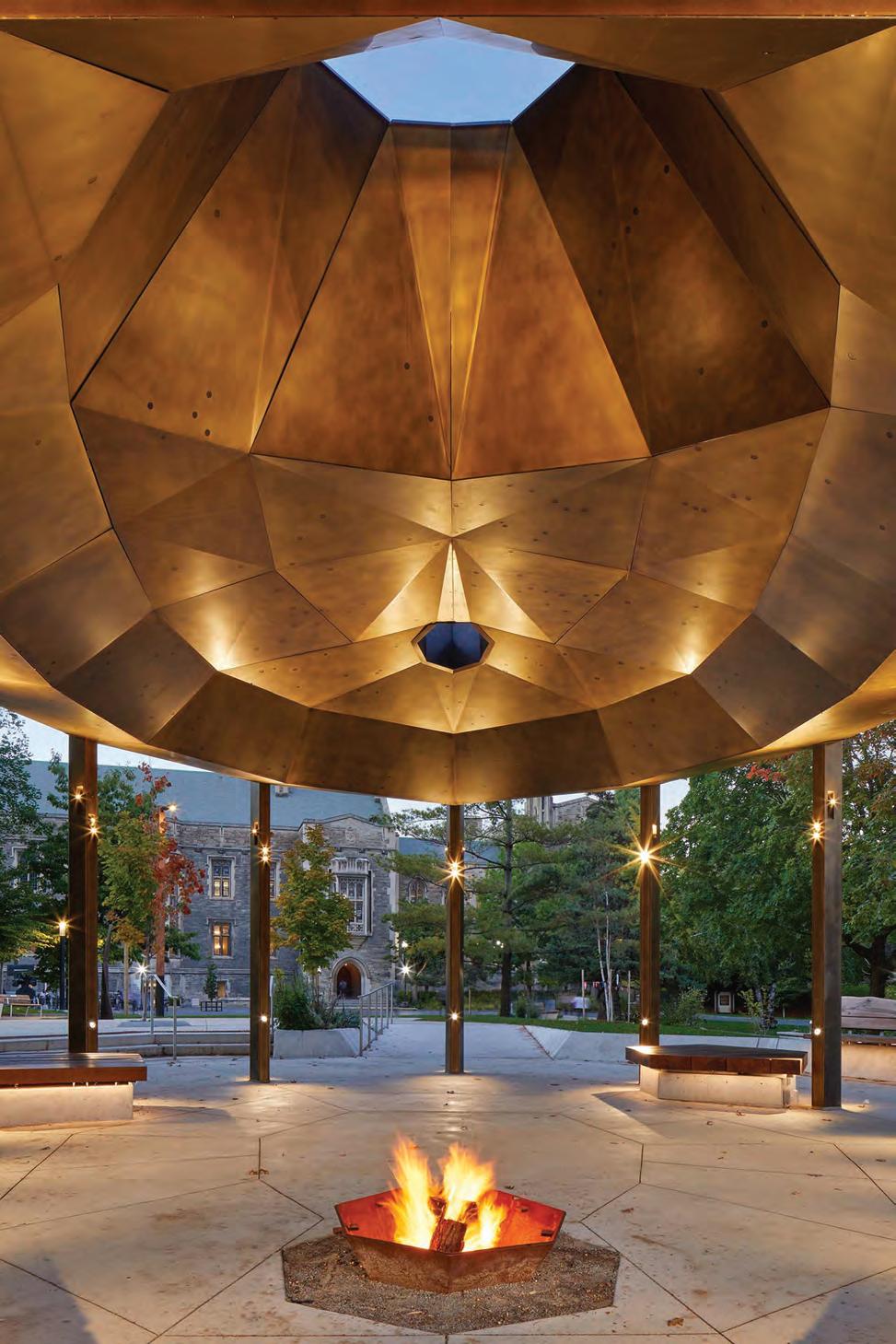 North Star, which appears to remain stationary in the Northern Hemisphere’s sky. Four branching, sculptural bronze forms surround the pavilion, marking the cardinal directions. Located at a primary entrance to the campus, the east marker is axially connected to Knowledge House by a water feature memorializing Taddle Creek: pebblelined troughs flanking a sloped pathway collect rainwater from the pavilion’s roof and drain it into a rain garden.