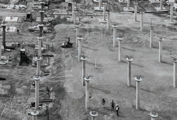 lawn to construct a massive geo-exchange system. We see a framefilling grid of mushroom-capped columns, each topped with a frizz of rebar. These are the roof supports for the 236-car garage that will sit atop the geo-exchange field and nestle under the lawn.