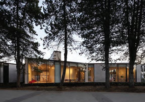 the lawn for optimal shaping and drainage. The garage’s asymmetrically pitched roof directs water in the subgrade into a cistern, for repurposing as the primary source for drip irrigation to the circle’s planting beds. Among the site’s formidable existing challenges was what KPMB’s Jones calls a “bird’s nest” of underground utilities. Only partially documented prior to construction, this subterranean infrastructure complicated the important task of finding suitable places to plant new trees.