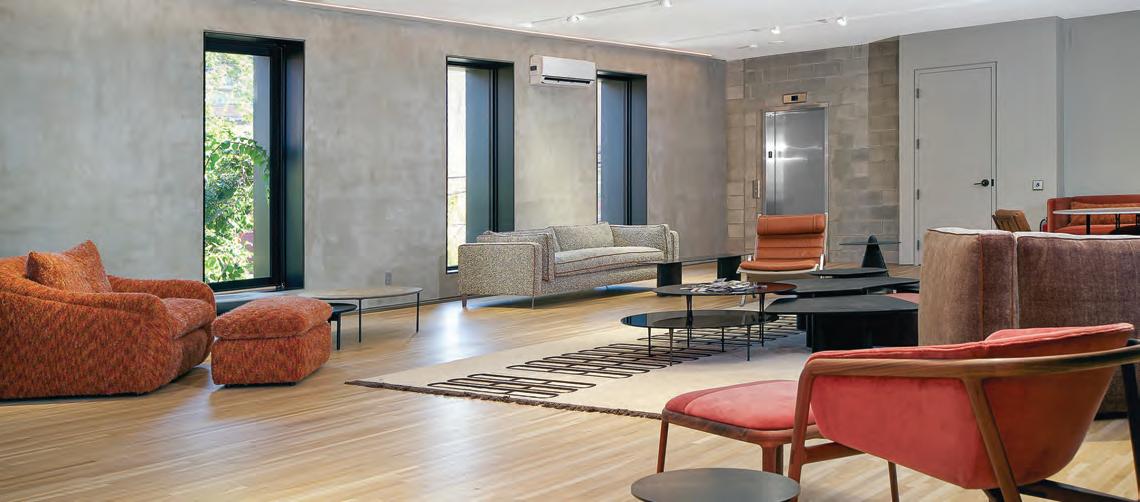 concrete walls. The lower level retains the building’s original brick and stone walls. The furniture and fabric library located on the second floor provides a work environment for designers to collaborate with clients. “A lot of designers don’t have offices anymore; they’re welcome to come here and meet their clients,” Chartier said. On the top floor, new perimetrical skylights flood the interior with daylight. Throughout, the focus is always on the sofa; there’s never a sense