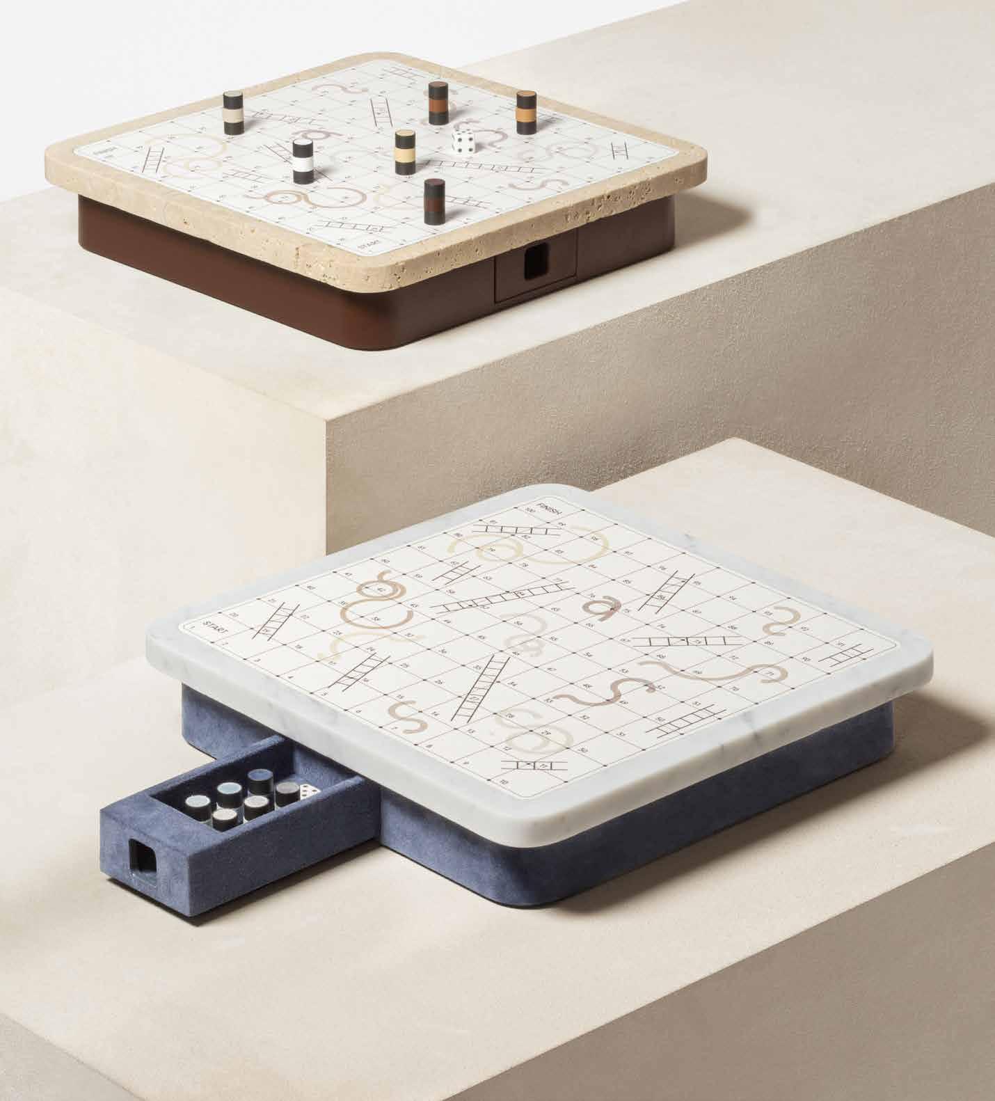 3 Game sets | Giobagnara Giobagnara turns game night into a tactile design experience. The Delos Snakes & Ladders pairs leather-clad wood with metal pieces in chrome, bronze, or brass. The Mahjong set wraps tradition in sleek leather and bakelite. Mocambo Backgammon, in walnut and printed marble, channels architectural gravitas. With refined detailing and customizable finishes, these sets are as at home in a yacht salon as a designer’s library. www.giobagnara.com