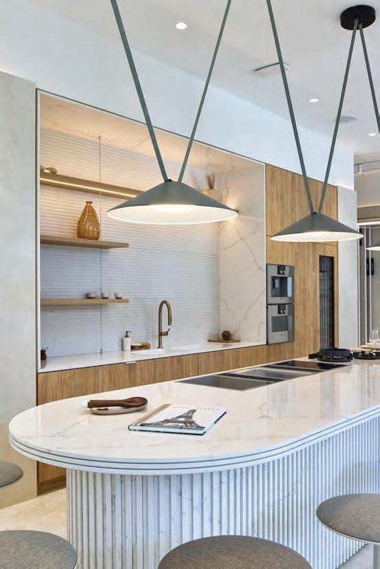 texture also evokes the patterns of raked sand in Zen gardens.) The worksurface is equally intriguing. The 60mm countertop was built by layering three 20mm Silestone slabs, each separated by a five millimetre groove, creating gaps that add depth and texture without compromising strength.