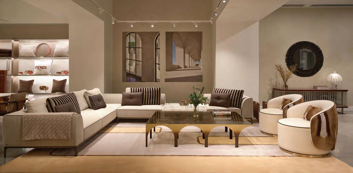 Opposite page Maison Territo’s welcome counter blends noble materials with a sculptural brass pendant light designed by Verchères, Que.-based Larose Guyon, which adds an airy, luminous touch. Above The Fendi Casa living room blends clean lines and architectural details, true to the Roman elegance of the brand.