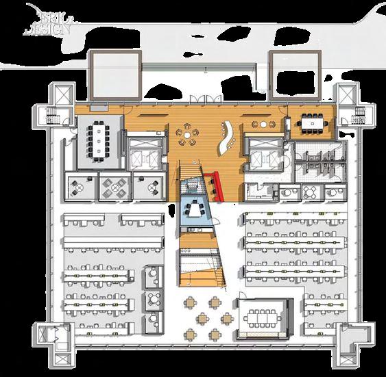 The mezzanine increases total square feet to 45,000 and changes scale. "The building became less majestic, more welcoming to potential clients," Jernigan observes. He then transformed the organization from horizontal to vertical and high-visibility.