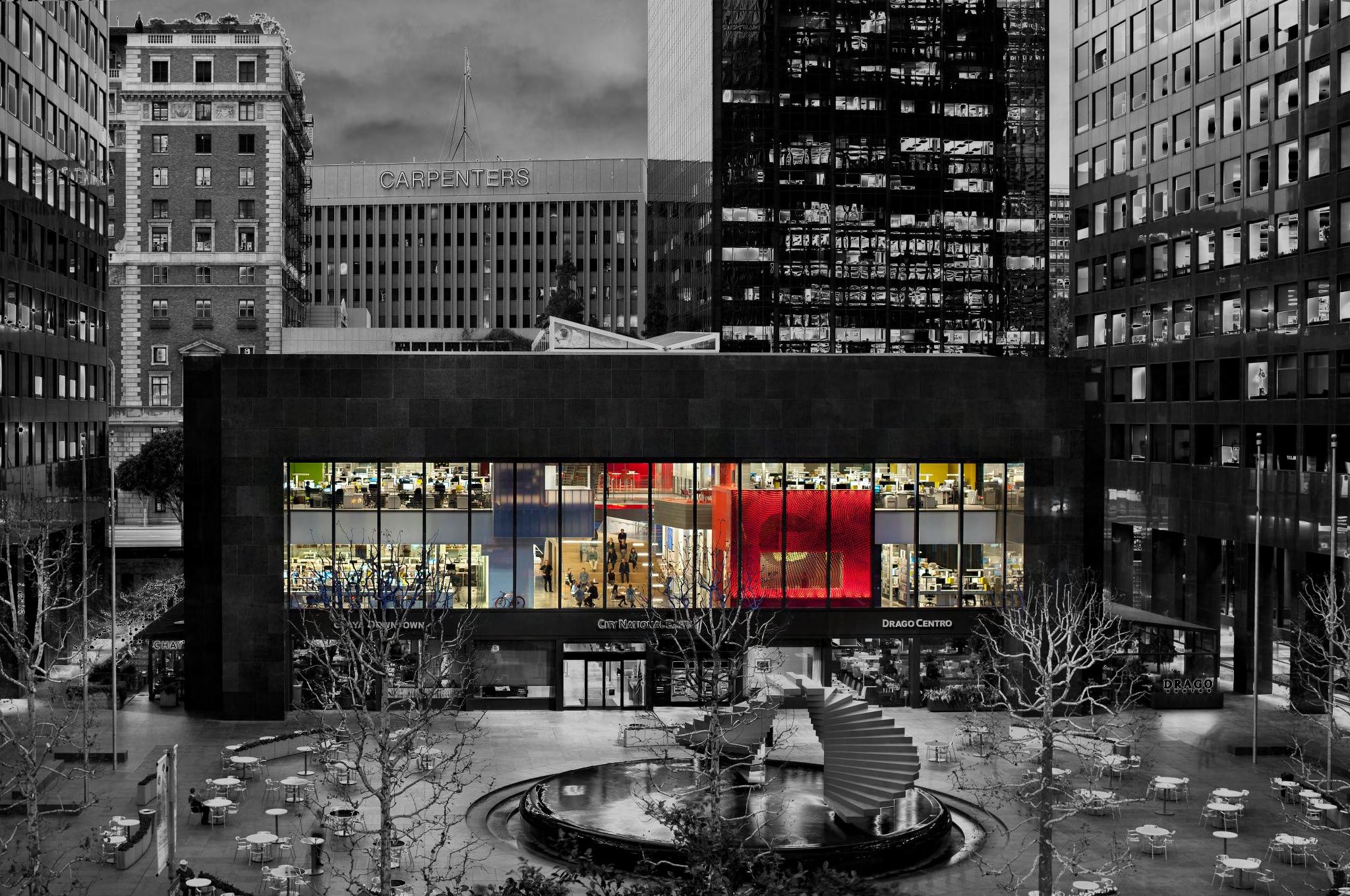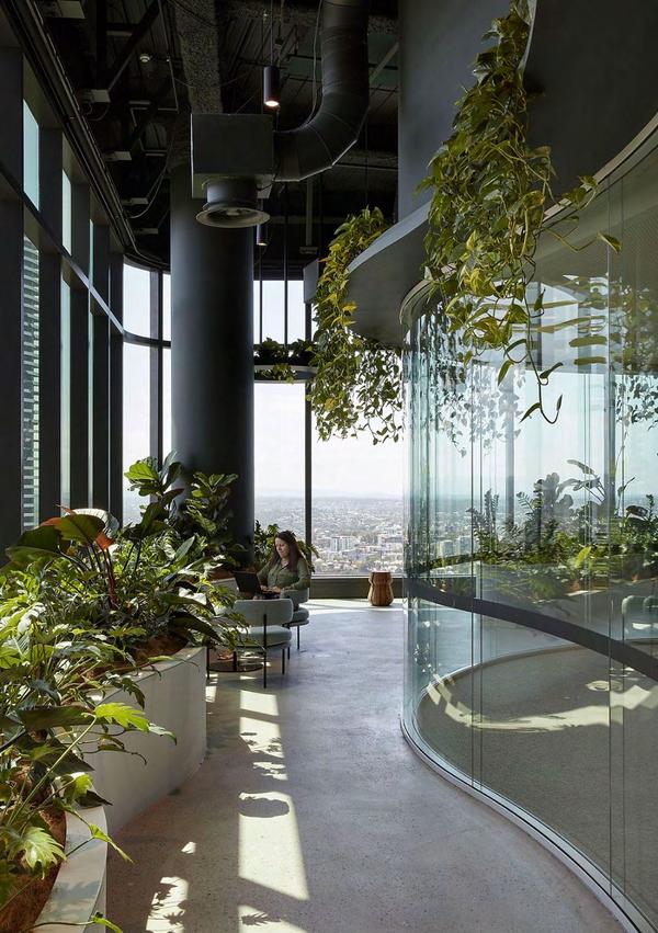 With a street-level entry located at 500 South Figueroa St., the campus is comprised of a three-level atrium building connected via a custom-designed bridge to an adjacent tower. The LEED Platinum workplace serves as a creative lab for architects, designers, planners and the community. The campus features flexible workspaces, a model shop, wellness rooms, an outdoor meeting patio, a family room with a bar for coffee and snacks, and a special events space.