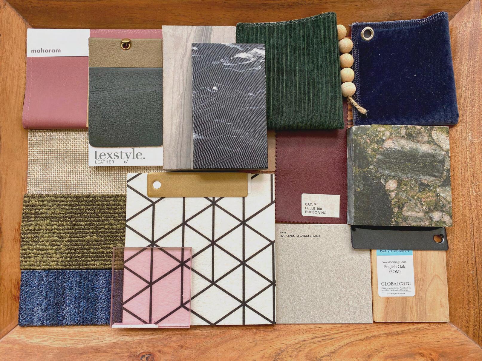 WHITE OAK GRIGIO CHIARO CEMENT GEOMETRIC RUG COLORED GLASS BLUE CARPET TILE GREEN MARBLE ROSSO VINO LEATHER KNOLL TEXTILES BLUE VELVET GREEN LEATHER 028 SORBET LEATHER