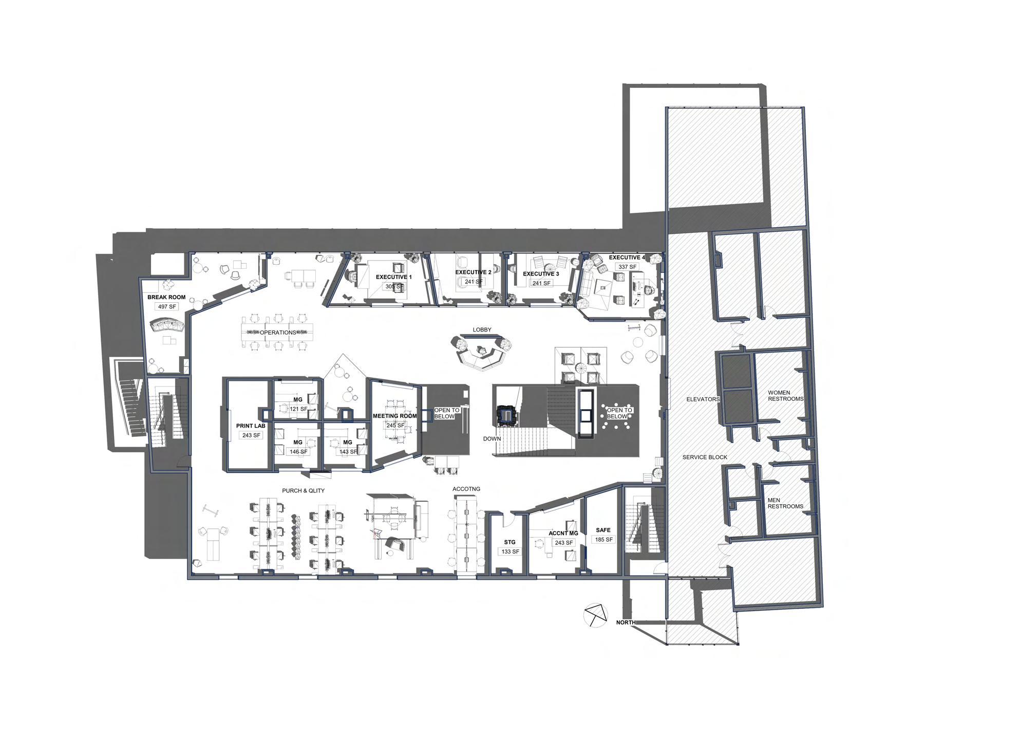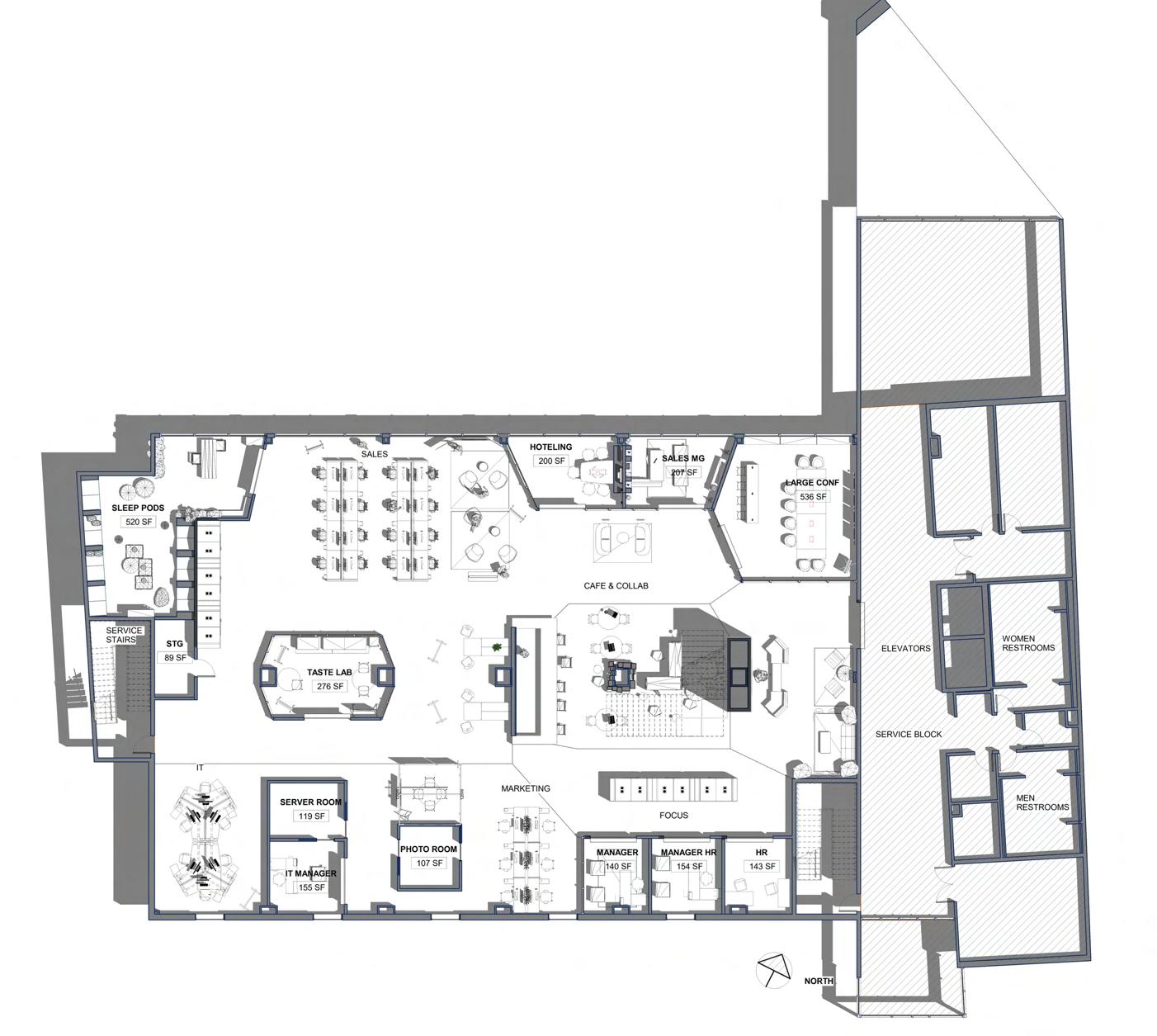 FOCUS HUDDLE ROOM MEDITATION ROOM LOBBY DISPLAY LARGE CONFERENCE ROOM CAFE MARKETING OPEN COLLAB HYBRIDROOM TASTELAB HR SALES IT BREAK ROOM STORAGE FOCUS ROOM OPEN TO BELOW HUDDLE ROOM PRINTING EXECUTIVE SUITE MEDIUM CONFERENCE COLLAB ACCOUNTING STORAGE STORAGE LOBBY PURCHASING QUALITY ASSURANCE OPERATIONS PUBLIC EMPLOYEES