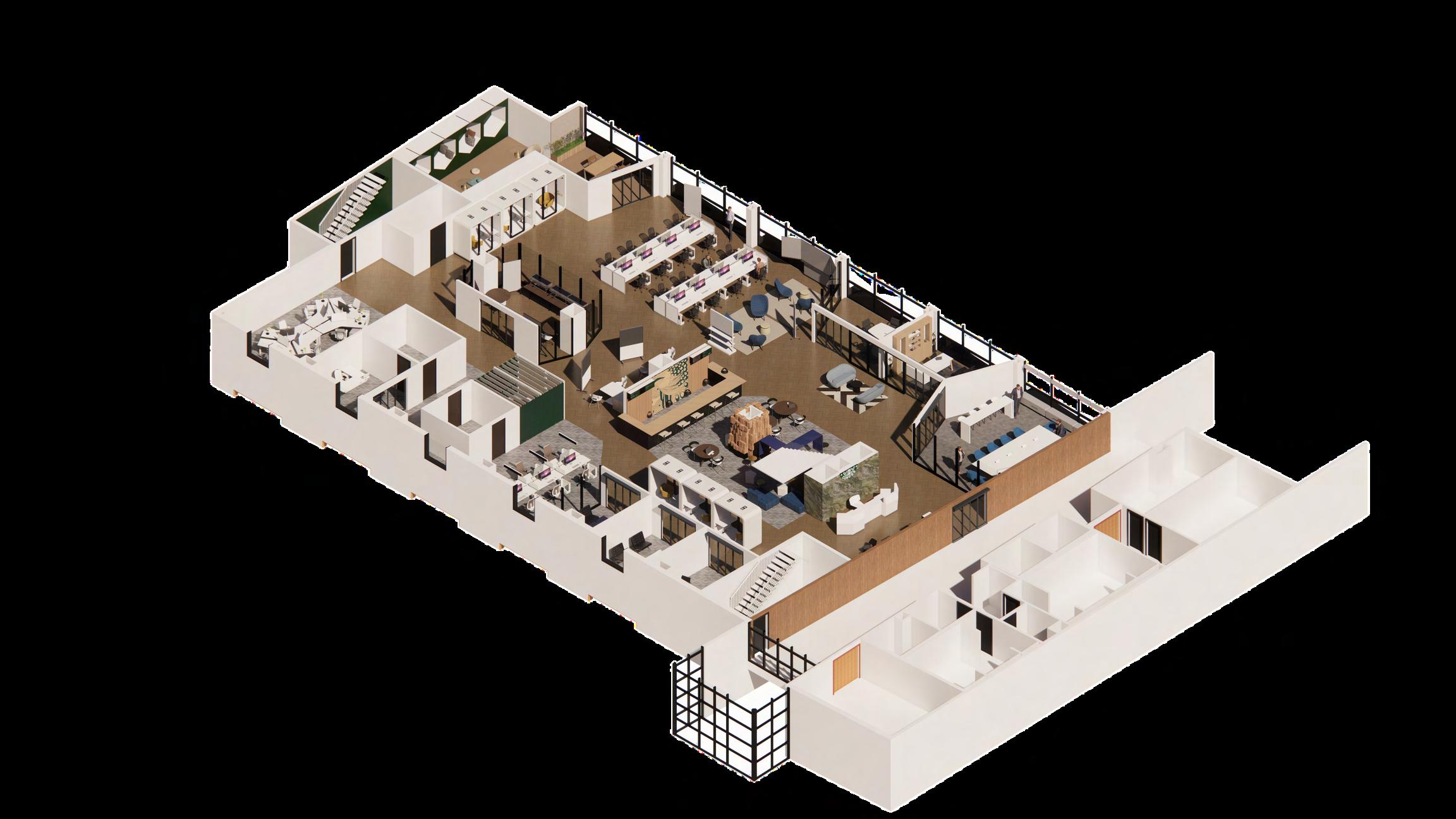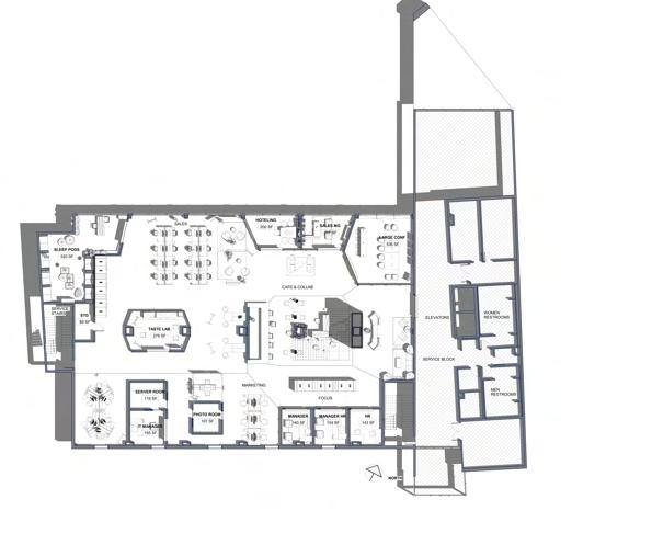 FLOOR 2 FOCUS HUDDLE ROOM MEDITATION ROOM LOBBY DISPLAY LARGE CONFERENCE ROOM CAFE MARKETING OPEN COLLAB HYBRID ROOM TASTE LAB HR IT SLEEP PODS STORAGE