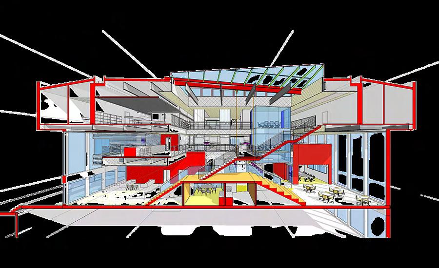Around the atrium, meeting rooms stack and cantilever. Yes, Gensler red brightens the officescape, which is enclosed in laminated glass. Others are wrapped in zinc panels or—in the case of the Tree House, which floats over the main lounge— translucent white polycarbonate. The various materials come through loud and clear, causing the entire space to vibrate with kinetic energy.