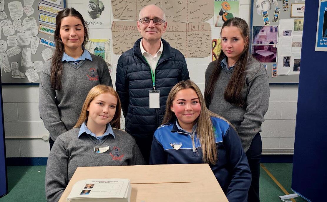 CSPE students Niamh Aherne, Ayda Hickey, Holly O’ Riordan and Katie Nolan with teacher Mr. Corbett presiding over democracy ahead of the presidential election.