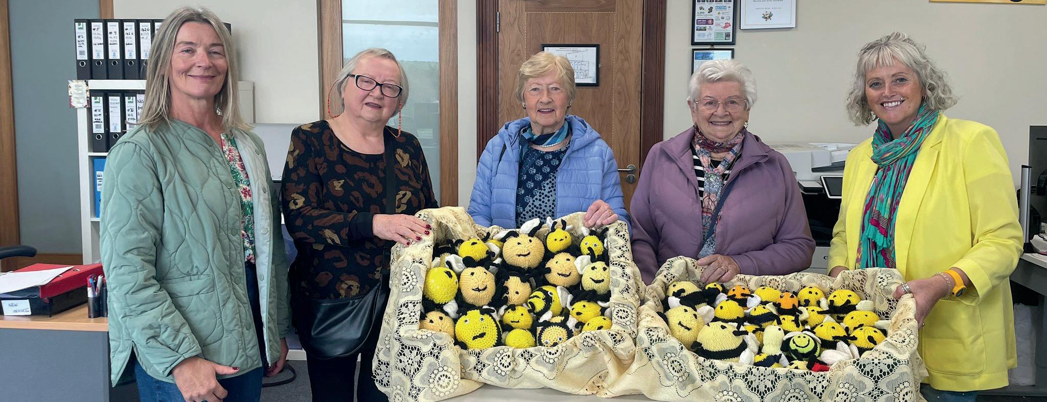 Michelle, Eily, Theresa and Breeda of the Knit and Natter Group, proudly present their swarm of knitted bumblebees