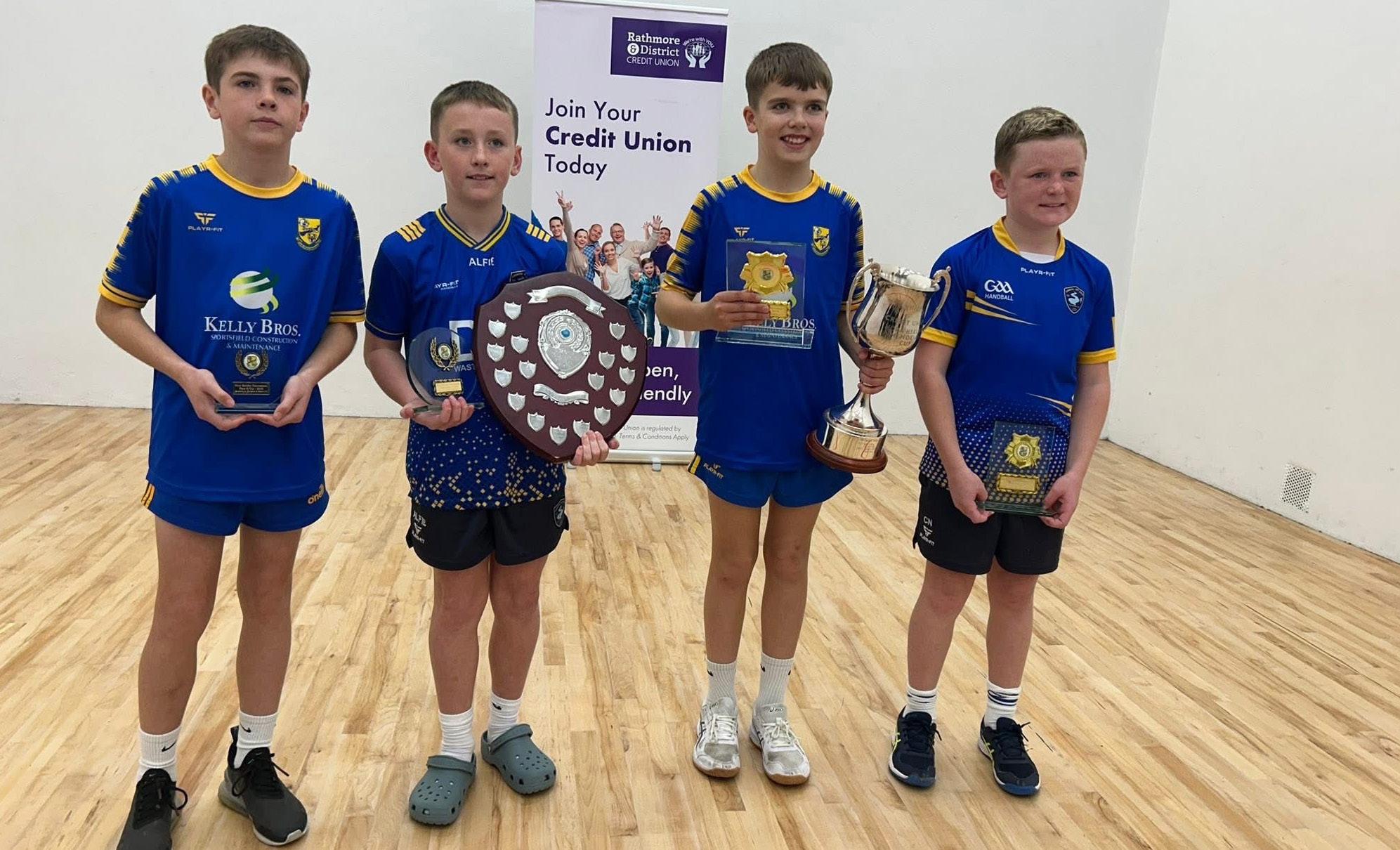 Tadgh O’ Connor, Ballydesmond runner up in the Plate Final, Alfie Finn, Carrig on Suir, winner of the Plate Final, Cilian Healy, Ballydesmond, overall winner of the Cup Final and Conner Nolan, Carrig on suir, runner up in the Plate Final, pictured at the Nora Herlihy Memorial Handball Tournament which was sponsored by Rathmore & District Credit Union and hosted by Ballydesmond Handball Club last Sunday