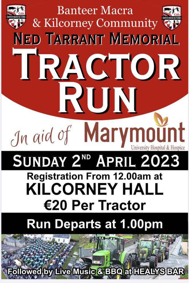 The Ned Tarrant Memorial Tractor Run committee recently launched its tractor run for 2023 at Healy’s Bar, Kilcorney.