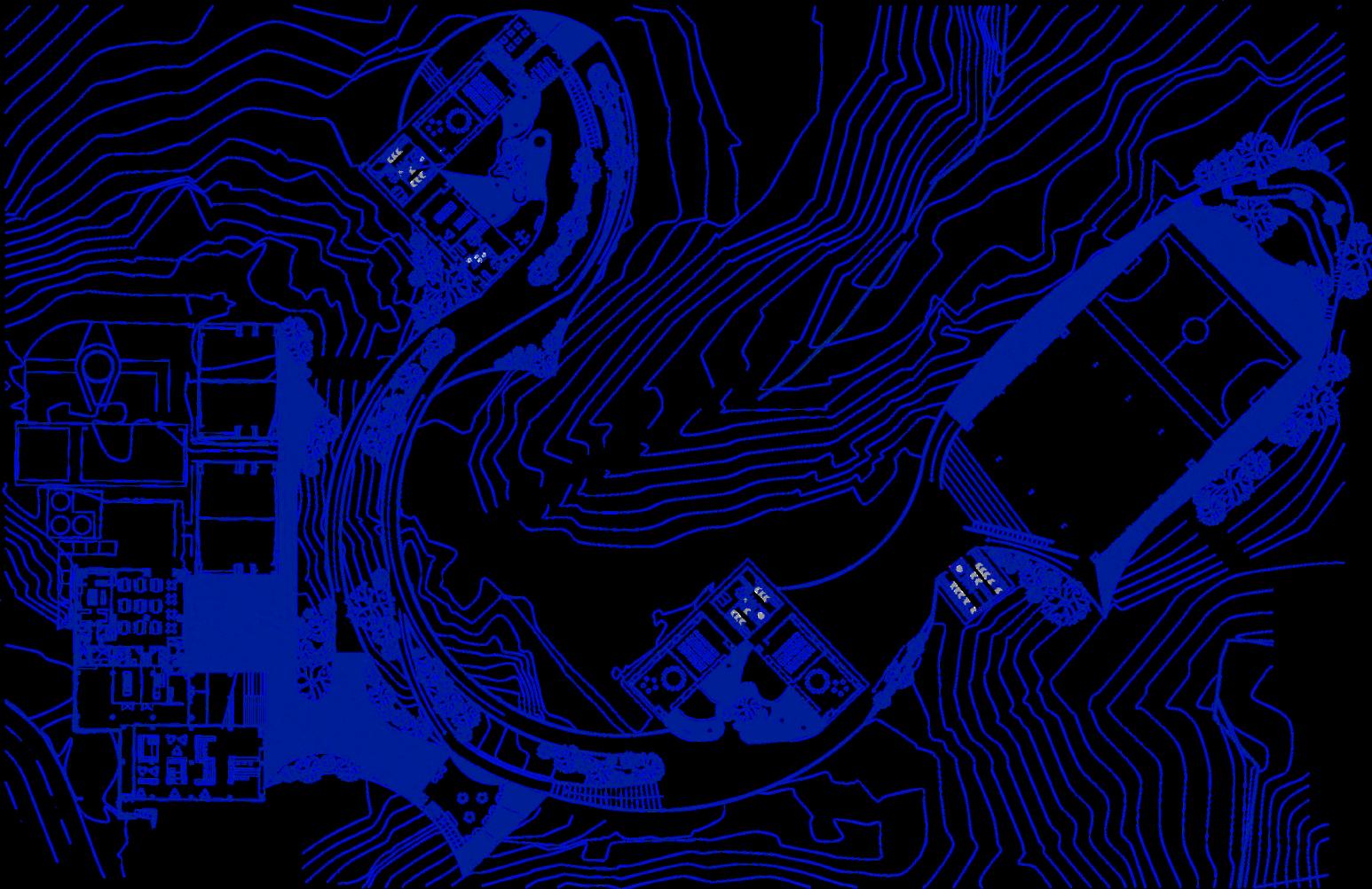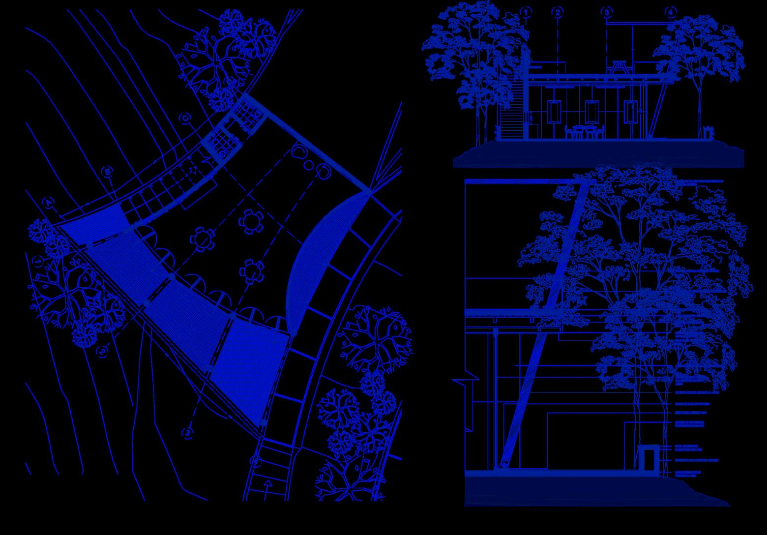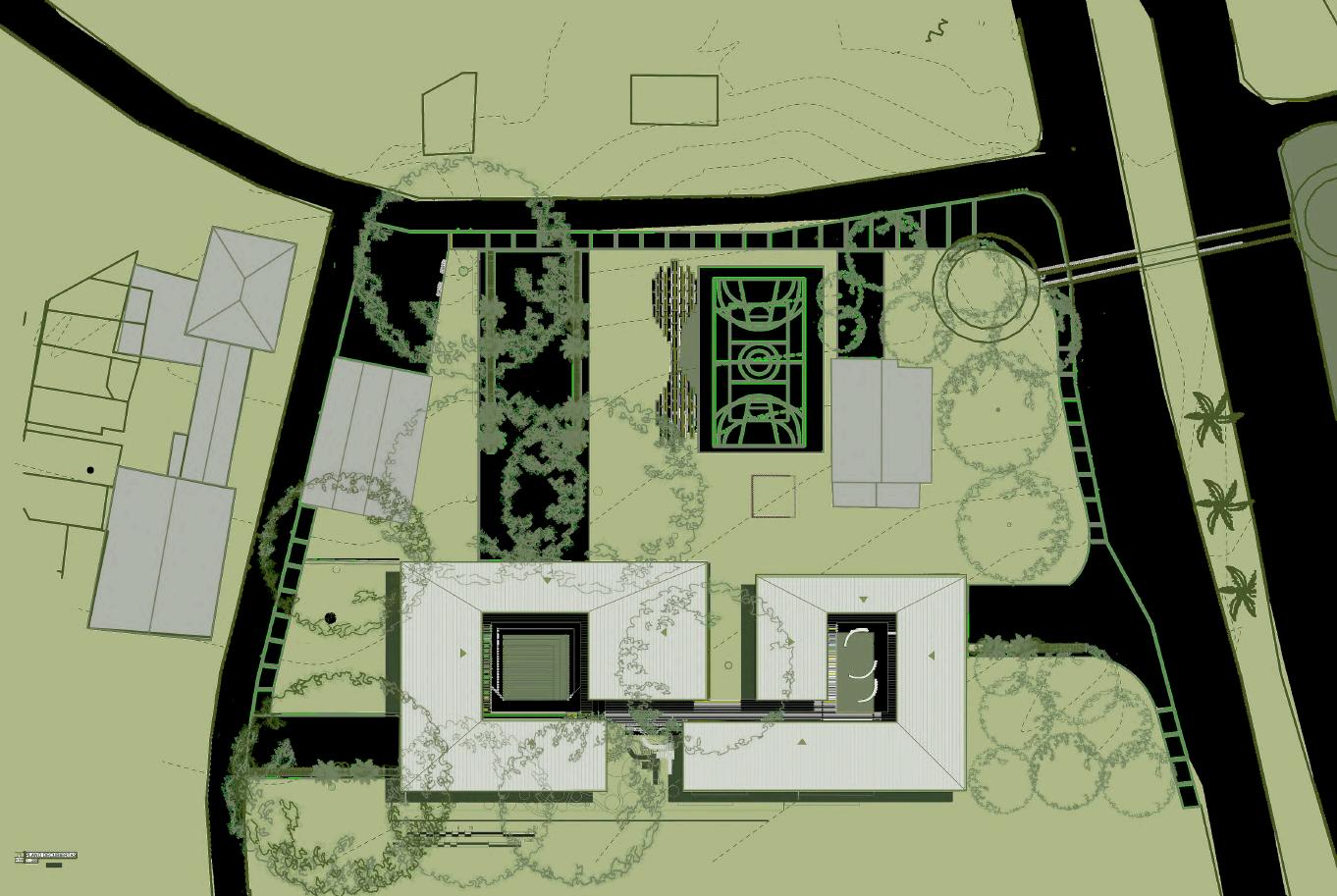 Se emplean formas orgánicas que siguen el trazado natural del relieve, ubicando el proyecto a partir del reconocimientodelasmasasarbóreasexistentes.Elobjetivocentraleslograrunaarquitecturaquedialoguecon elpaisaje,dondeloselementosconstruidosnoseimpongansobreelentorno,sinoqueseadaptenaéldeforma respetuosayarmónica.