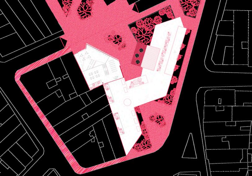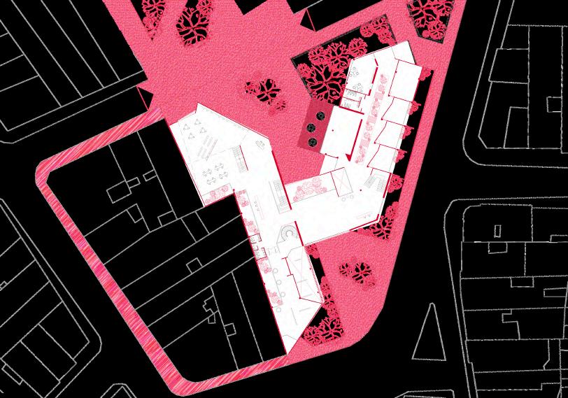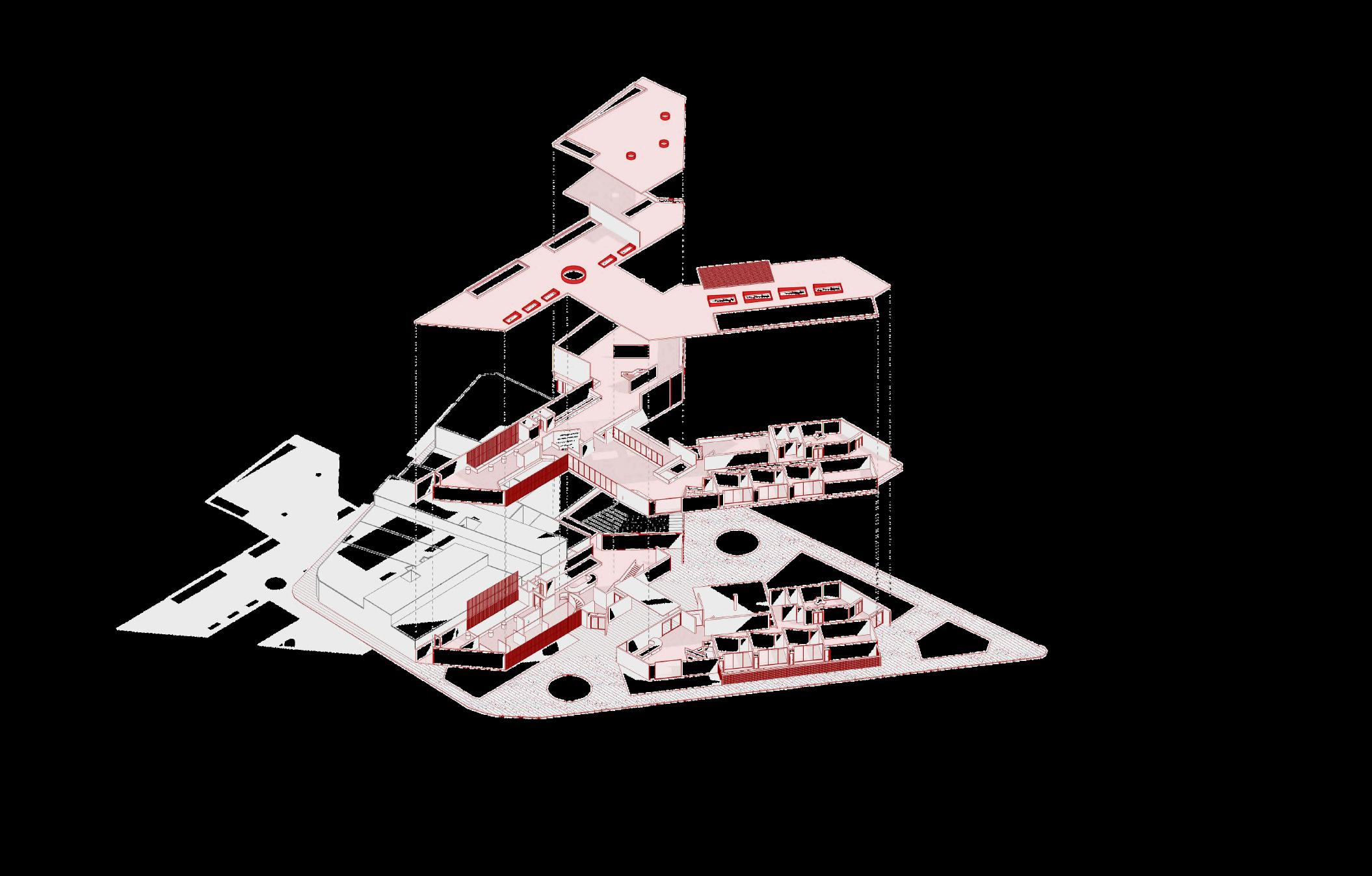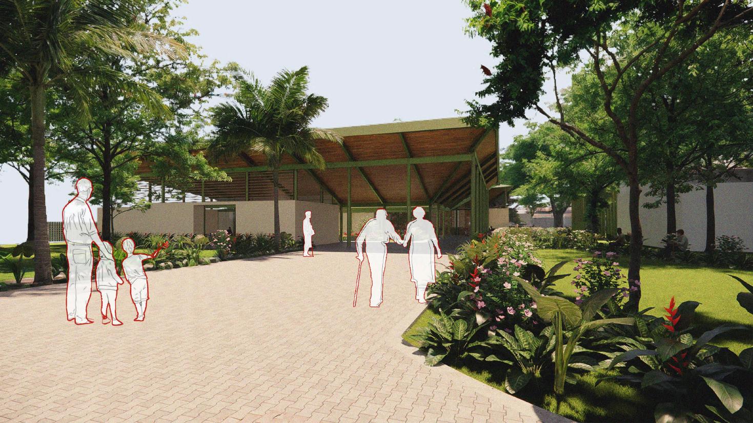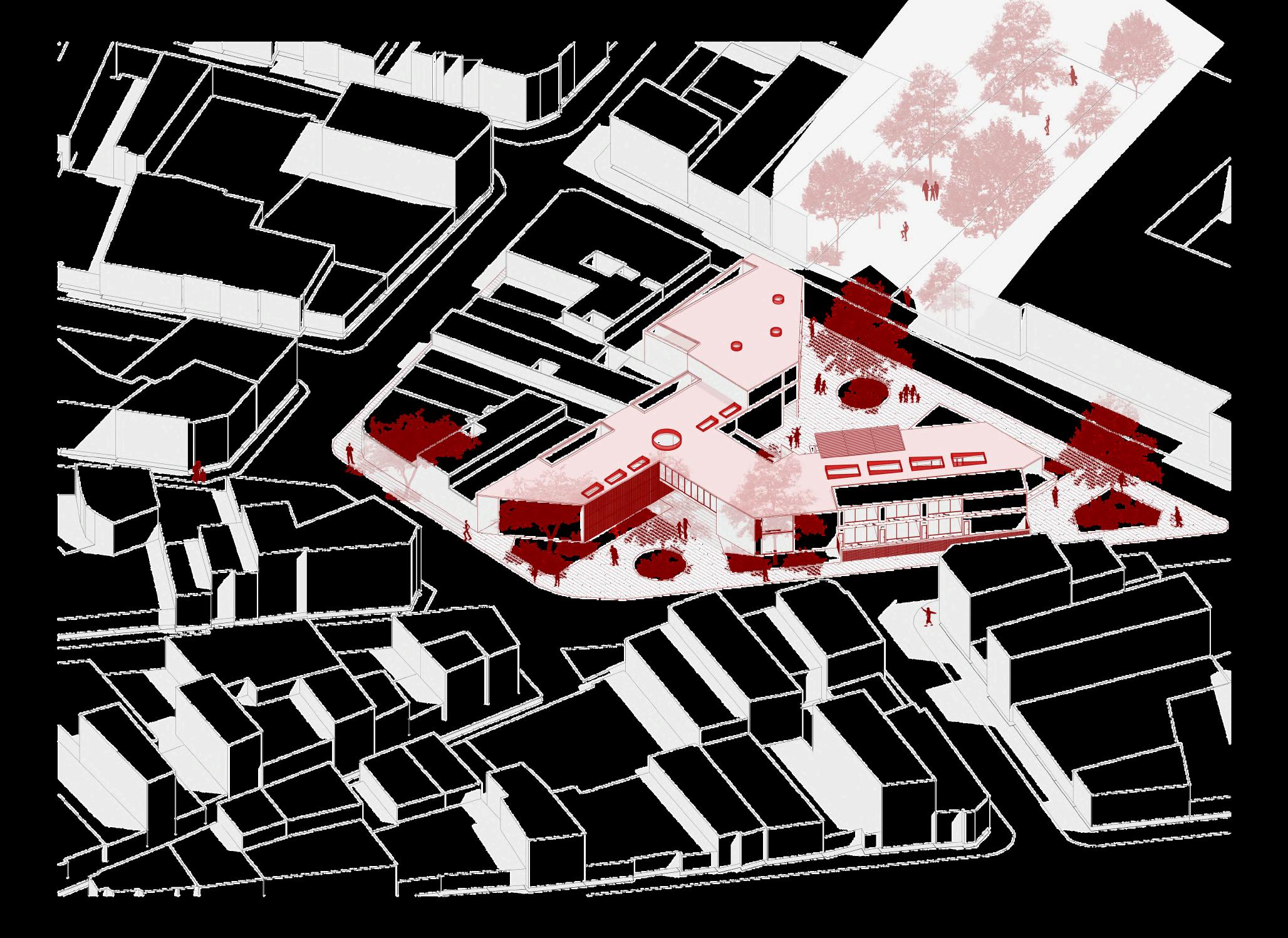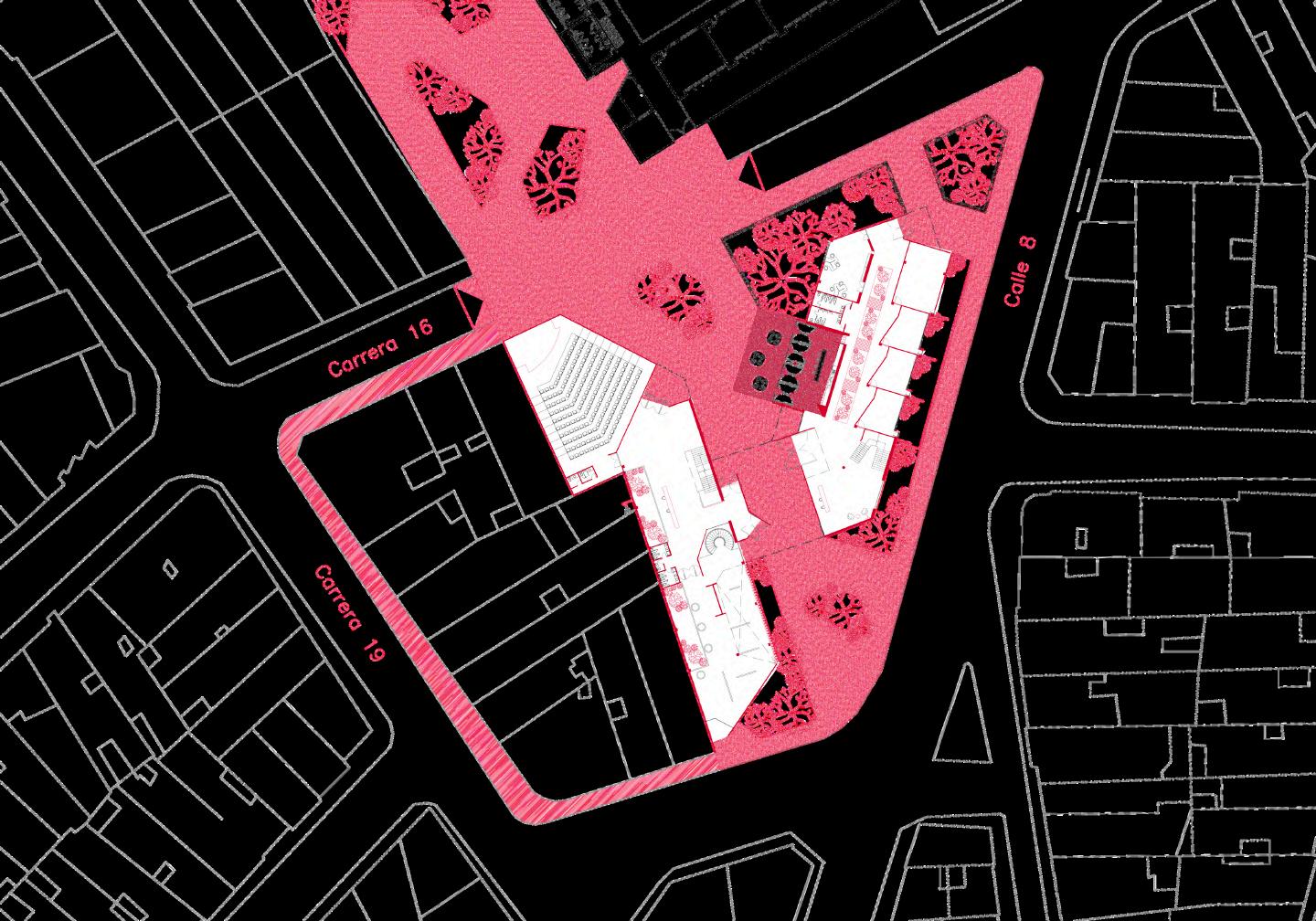 Se organiza a partir de dos naves rectangulares conectadas por un puente,quefuncionacomoumbralsimbólicoentreelespaciopúblico y la interioridad del edificio. Plazas de llegada abiertas al peatón invitanalencuentroyalaconvivencia,promoviendountejidourbano másactivoeinclusivo.