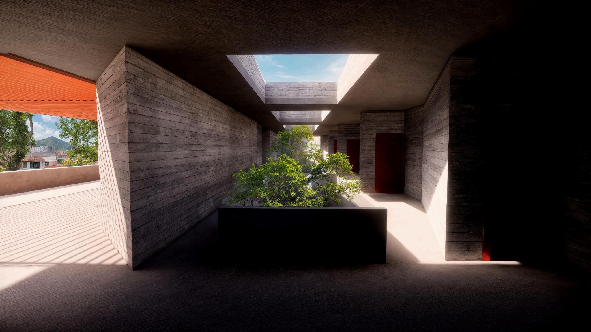 Este proyecto parte del análisis de la Casa de la Queja, obra del arquitecto Benjamín Barney en Cali, con el fin de comprender y reinterpretarsusestrategiascompositivas,técnicasyespaciales.A partirdeesteestudio,seplanteaunaresidenciaparaartistasbajo unenfoquedecoliving,quehabilitaespacioscompartidosparala creación,eldescansoyelintercambio. La propuesta fusiona forma, técnica y estética, estructurándose con precisión a partir de una retícula de 1.60 x 1.60 m y el uso de cubiertas inclinadas a 45°, elementos que definen su carácter arquitectónico. El proyecto se organiza en tres pabellones dispuestosentornoaunpatiocentral,elcualactúacomonúcleo jerárquico del conjunto, articulando las relaciones espaciales y visualesdesdetodoslospuntosdelinterior.