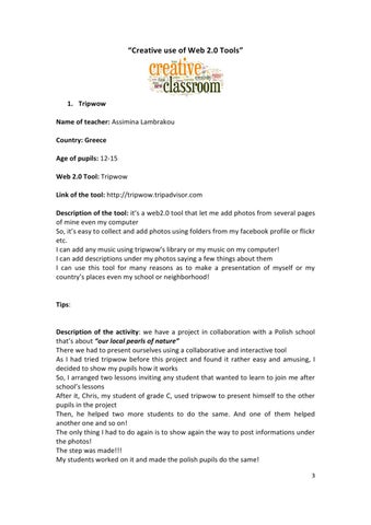 1. Tripwow Name of teacher: Assimina Lambrakou Country: Greece Age of pupils: 12-15 Web 2.0 Tool: Tripwow Link of the tool: http://tripwow.tripadvisor.com Description of the tool: it’s a web2.0 tool that let me add photos from several pages of mine even my computer So, it’s easy to collect and add photos using folders from my facebook profile or flickr etc. I can add any music using tripwow’s library or my music on my computer! I can add descriptions under my photos saying a few things about them I can use this tool for many reasons as to make a presentation of myself or my country’s places even my school or neighborhood!