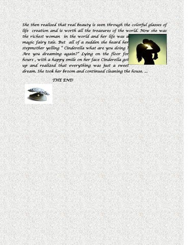 She then realised that real beauty is seen through the colorful glasses of life creation and is worth all the treasures of the world. Now she was the richest woman in the world and her life was a magic fairy tale. But all of a sudden she heard her stepmother yelling “ Cinderella what are you doing ? Are you dreaming again?� Lying on the floor for hours , with a happy smile on her face Cinderella got up and realized that everything was just a sweet dream. She took her broom and continued cleaning the house. ... THE END