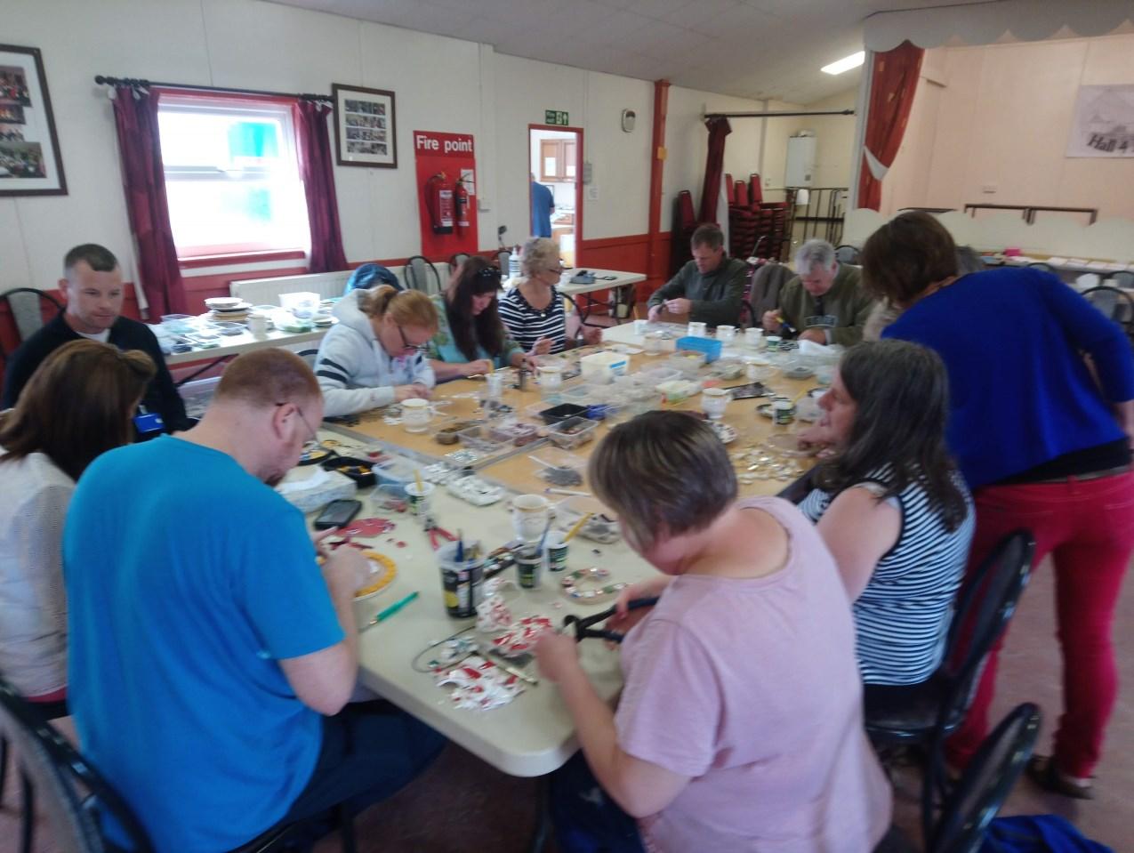 Top Left: MIND group at the Tin Chapel and Right: Hope and Cope support group the Methodist Church Hall, participating in a mosaic workshop with Anna Dixon