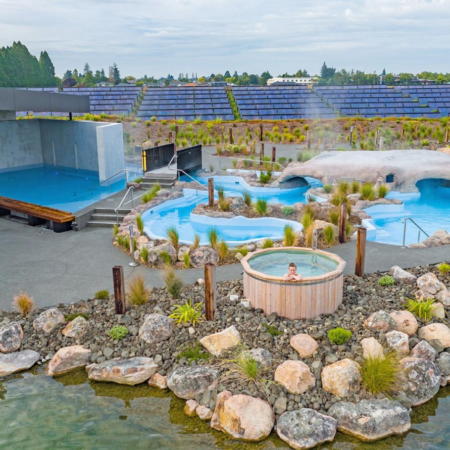 Built on the values of hospitality, family, appropriate action and stewardship, Ōpuke Thermal Pools’ vision is to provide a world-class experience with sustainability at the heart of its operations. It sources water from the Rangitata River that is fed by the glacial meltwater emerging from the spectacular Southern Alps and will source power from its large array of solar thermal collectors. These occupy approximately a quarter of the site and will serve as the primary pool water heating