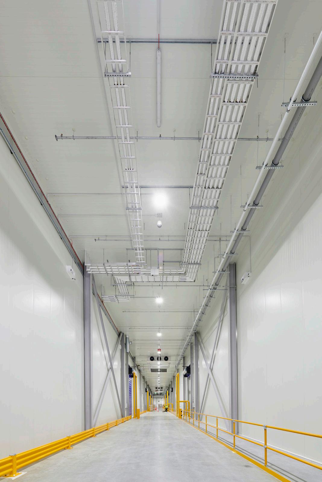 For example, during the design process, the layout was modified to transfer the CO2 refrigeration plant from its original remote location to within the facility itself on an upper access way. This design change reduced the 88,000m of piping to just under 7,900m. This change greatly reduced the pipe runs to the evaporators, leading to greater efficiency of the refrigeration plant and massively reducing the carbon footprint of the build.