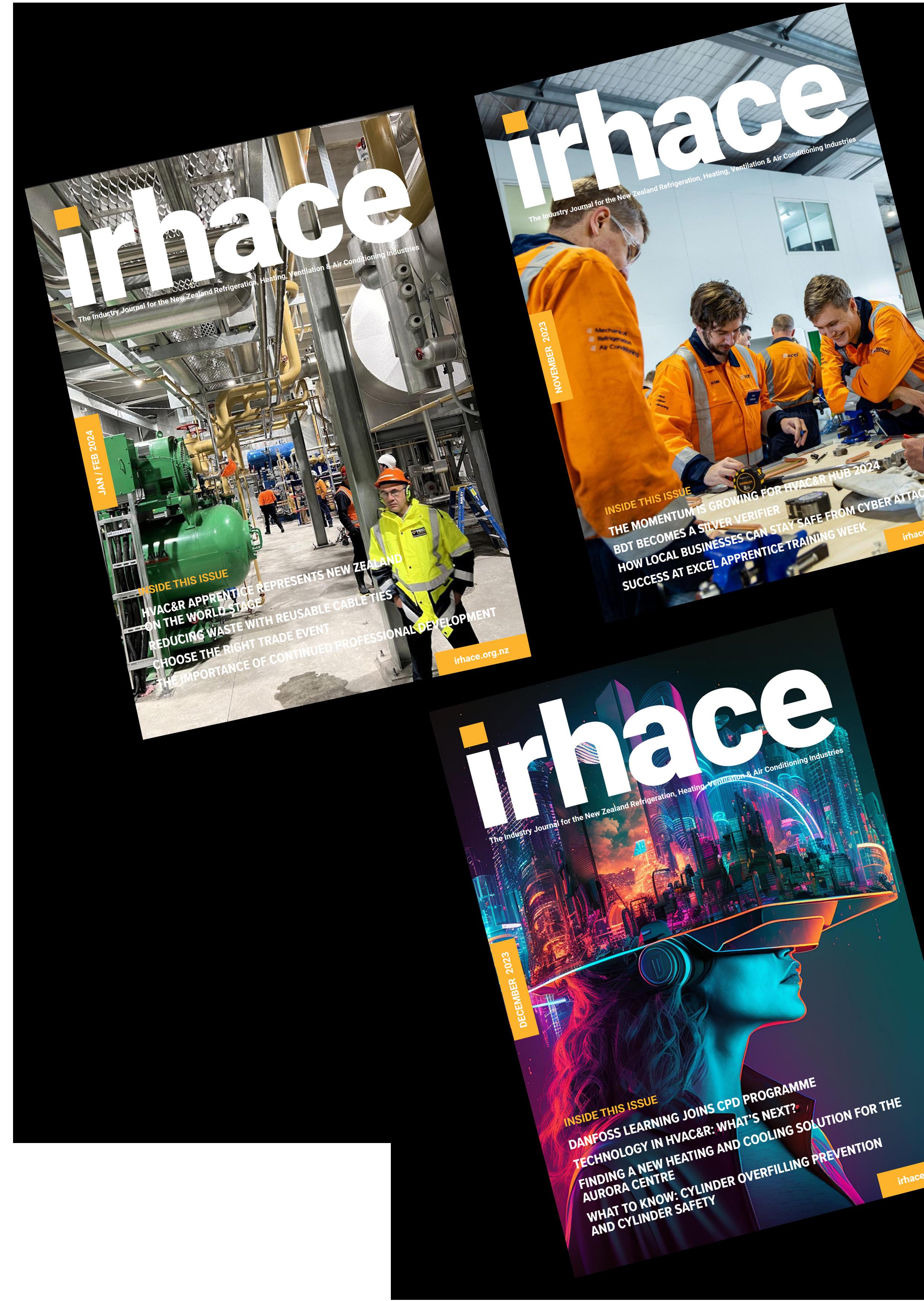 No part of this journal may be printed in other publications without prior written permission of the Managing Editor. Disclaimer: Statements expressed in this publication do not necessarily reflect the policies or views of the associations, and members of IRHACE or CCCANZ. The IRHACE Journal publishes both local and international articles. Standards and or practices may differ from current New Zealand standards and or practices used. No responsibility is accepted by the associations and editor for the accuracy of information or for errors or omissions. The IRHACE Journal is distributed to all the IRHACE and CCCANZ financial members.