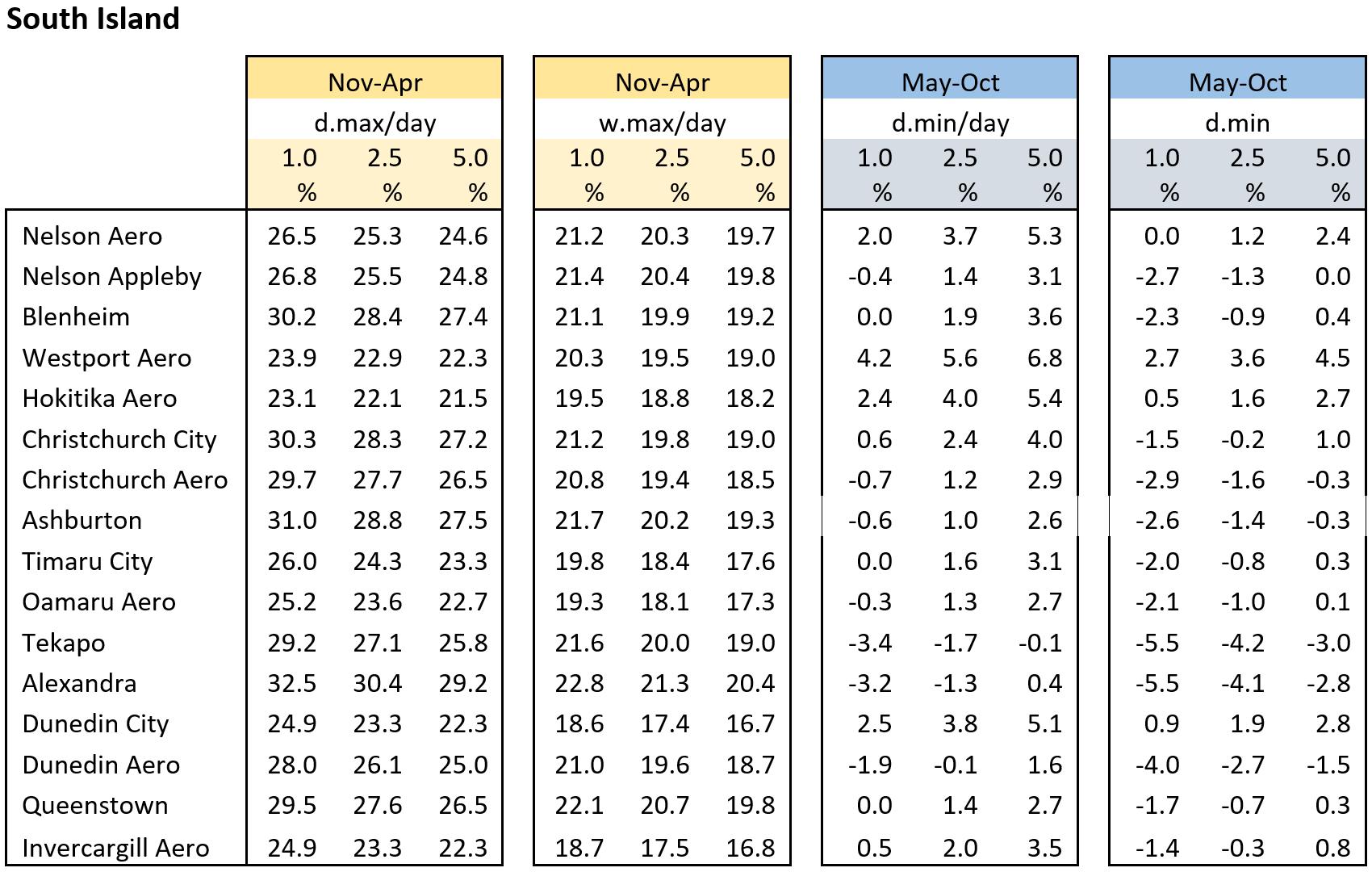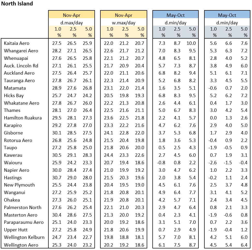d.max/day: Maximum dry-bulb temperature (°C) which will not be exceeded more than 1.0%, 2.5%, or 5.0% of the time (as specified) between 0800 to 1800 NZ Local Time from 1st November to 30th April.
