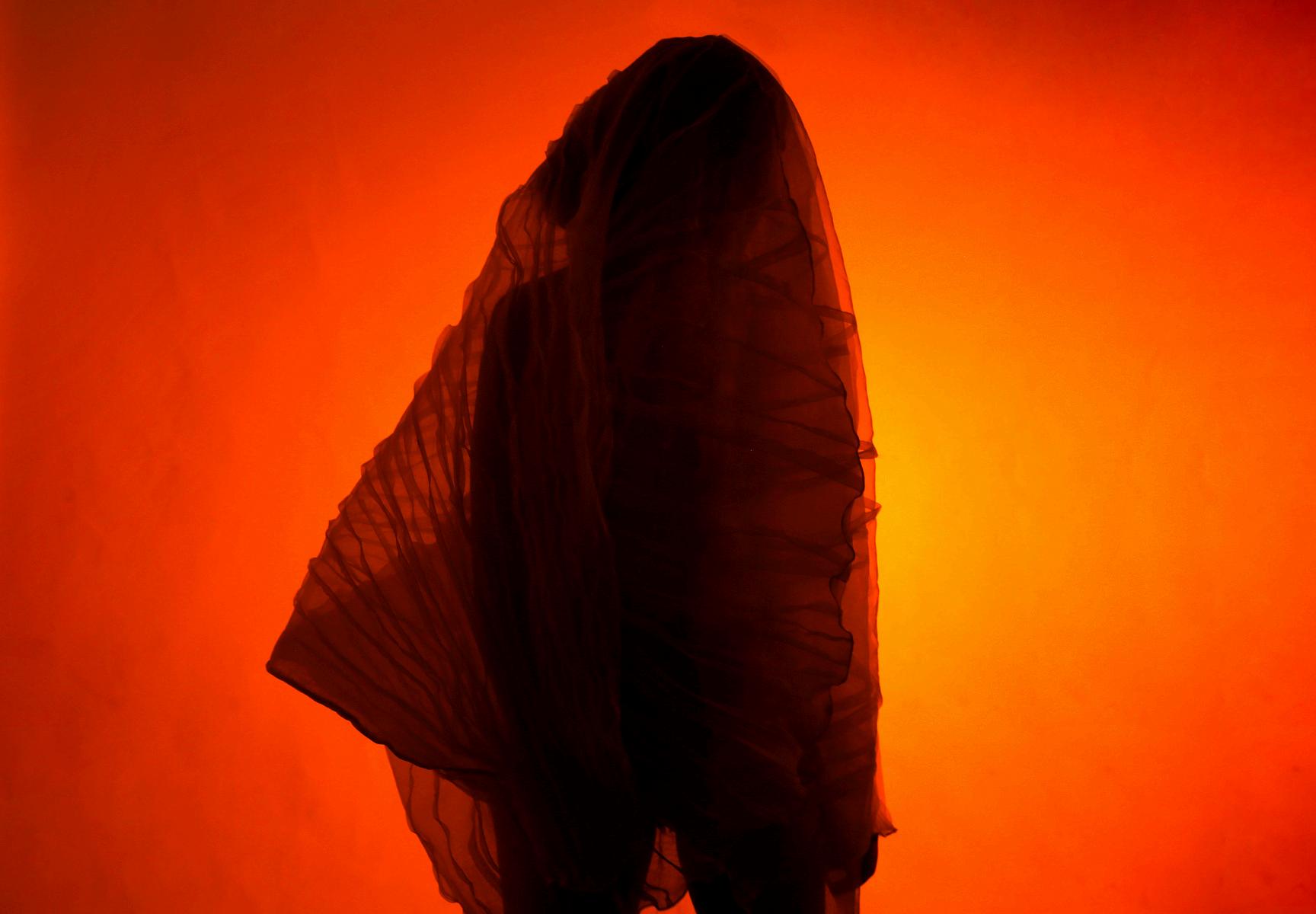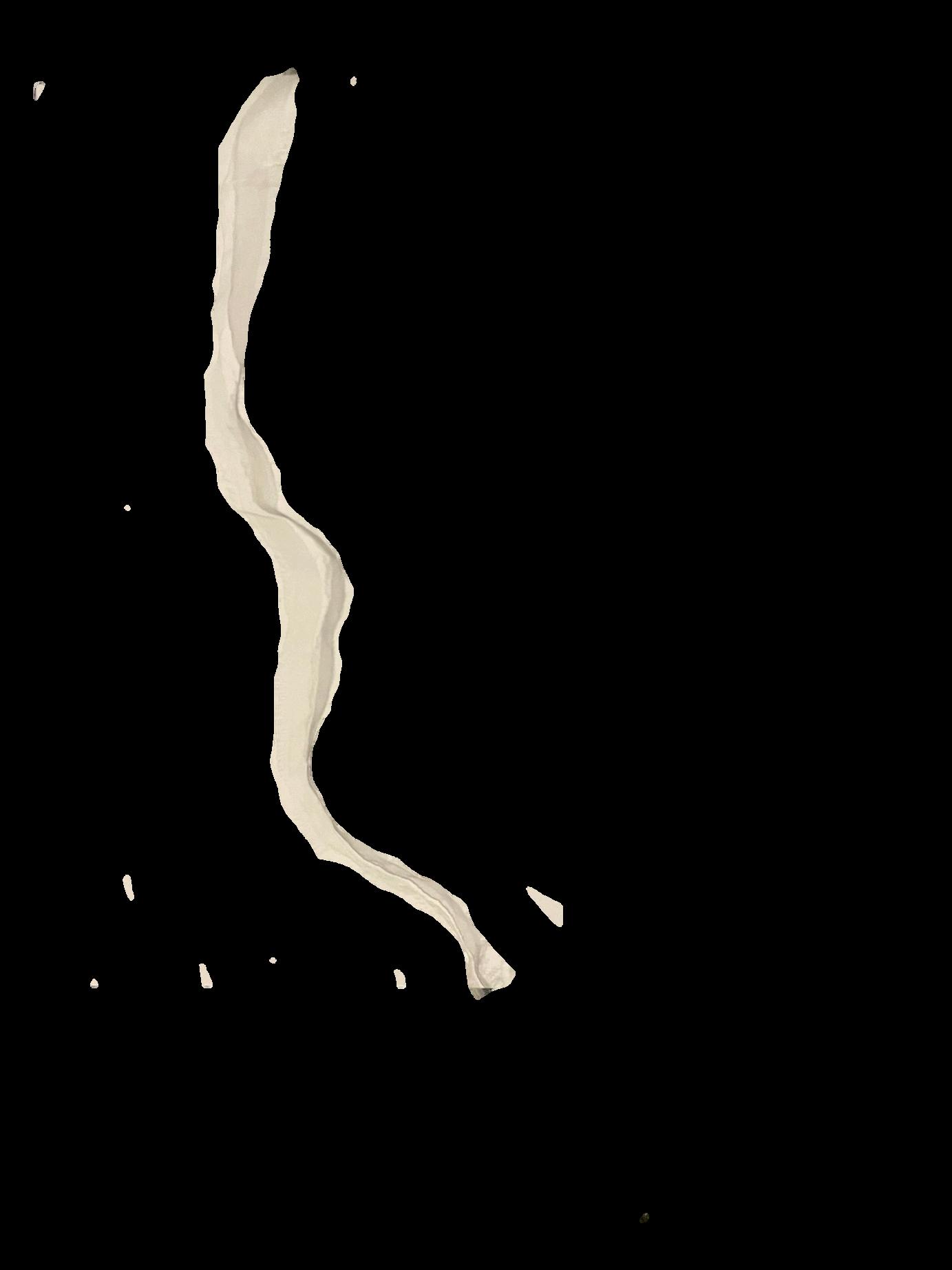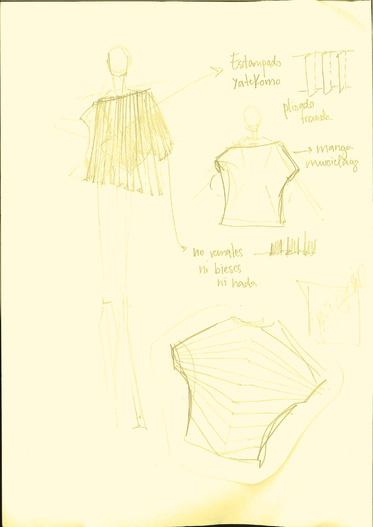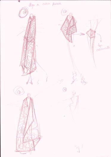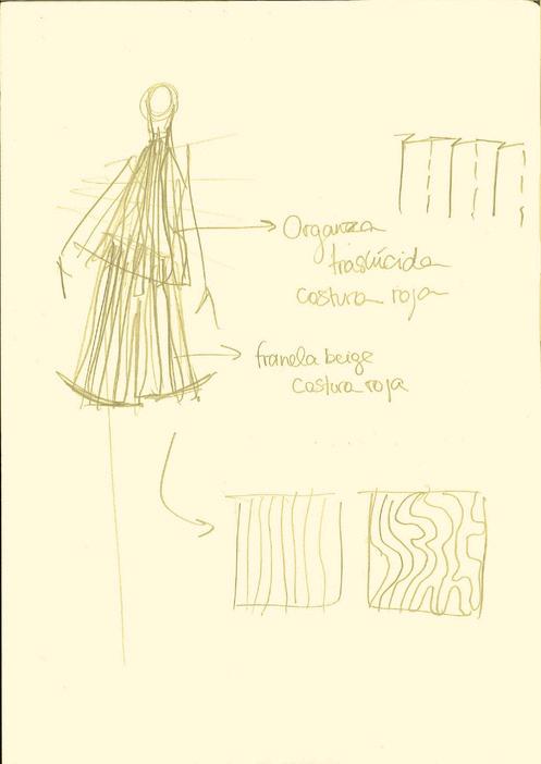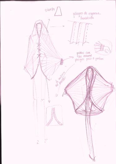 CAPA DE ORGANZA A PARTIR DE CUATRO SEMICÍRCULOS, COMO SE PUEDE OBSERVAR EN LA IMAGEN INFERIOR A PARTIR DE ESTE PATRÓN BÁSICO SE REALIZARON JARETAS IRREGULARES EN DIRECCIÓN RADIAL, LO QUE REDUJO CADA