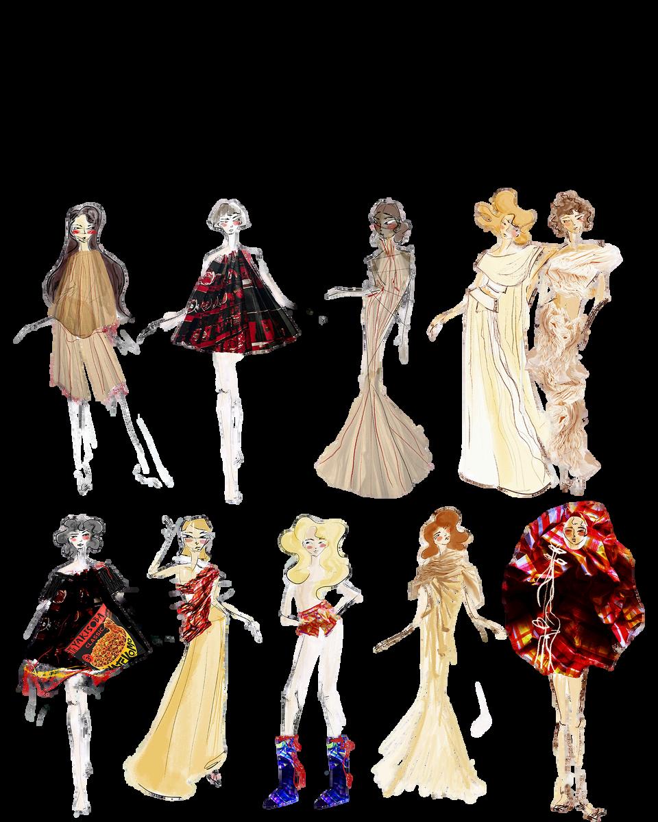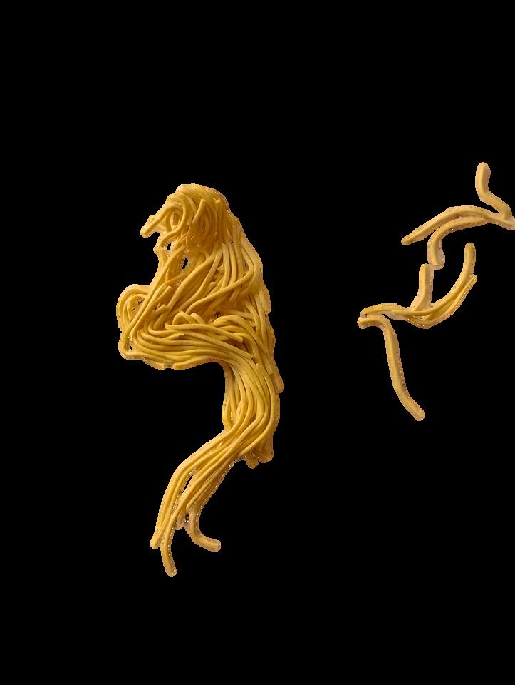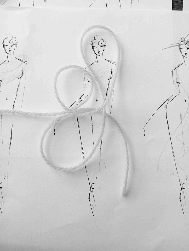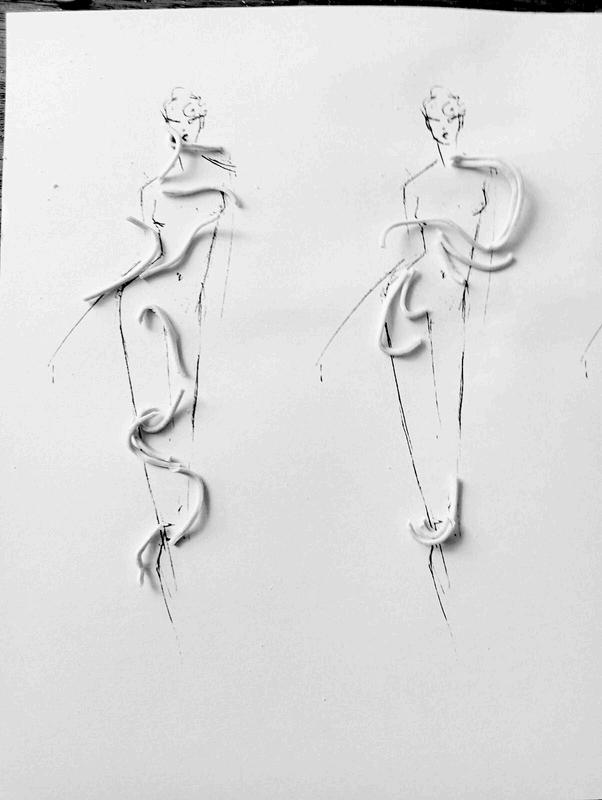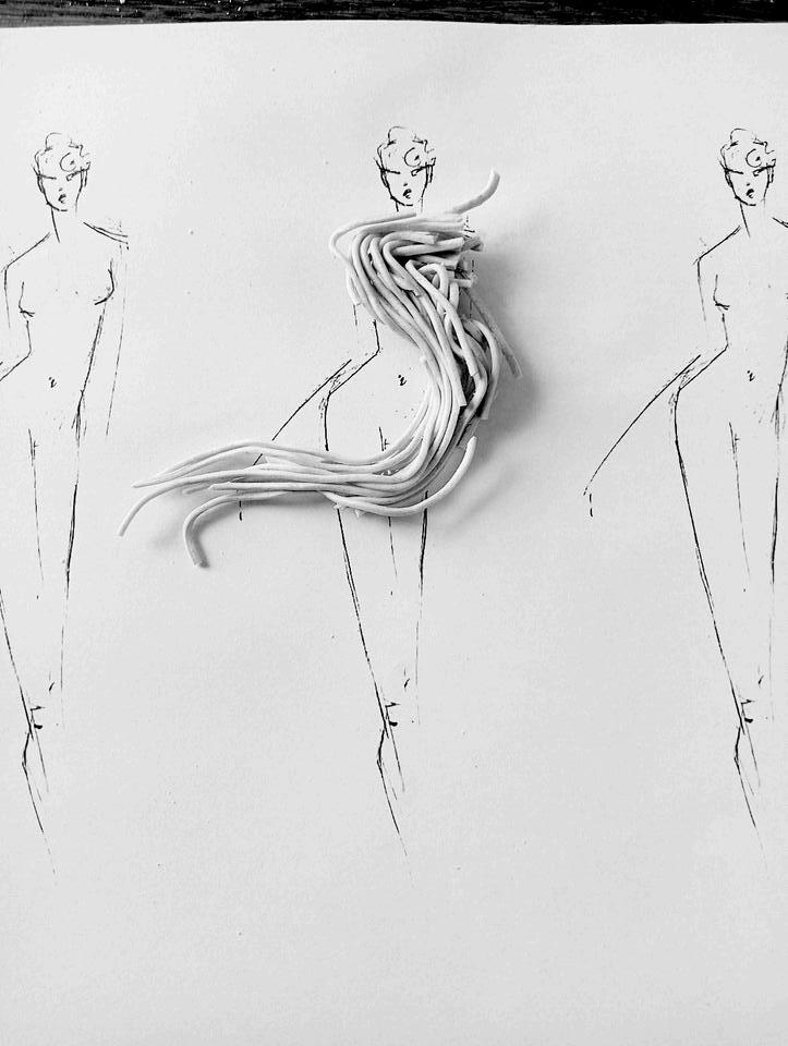 COMO SE PARTIÓ DE UNA MARCA DIRIGIDA A UN PÚBLICO JOVEN QUE SE PRESENTA COMO DESENFADADA, DIVERTIDA Y FÁCIL DE CONSUMIR, SE EMPEZÓ CON UNA INVESTIGACIÓN MÁS BIEN EXPERIMENTAL. LOS FIDEOS YATEKOMO DESTACAN POR SU TEXTURA, SU SABOR, SU OLOR, SU MOVIMIENTO. DE ESTE MODO, SE HICIERON UNAS PRIMERAS PRUEBAS CON LOS PROPIOS FIDEOS SOBRE LOS FIGURINES, INVESTIGANDO SOBRE LA FORMA, LA DIRECIONALIDAD Y EL GESTO.
